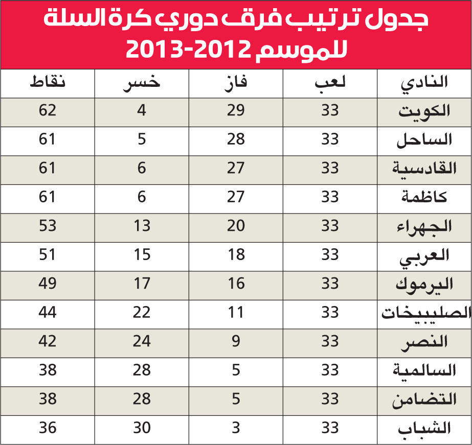 ورغم زيادة عدد المباريات للفريق الواحد وفق هذا النظام، وهو ما كان الاتحاد يبحث عنه، فإن المنافسة لم تكن حاضرة، بسبب اهمال بعض الاندية فرقها التي تشارك من اجل المشاركة، ولم تقم بالتعاقد مع محترفين أو حتى اقامة معسكرات تدريب استعداداً للدوري، وهذه من أسباب ضعف المستوى الفني للبطولة... وفي ما يلي مستويات الفرق خلال منافسات الدوري.الكويت صبر وناللعل فريق نادي الكويت، الذي توج بلقب البطولة، هو اكثر من استعد لها جيدا، من خلال اقامة معسكر تدريبي قبل انطلاقها، وتدعيم صفوف الفريق بمحترفين على مستوى عال، هما الاميركيين ديزموند وماريو اوستن، ثم تجربة عدد آخر بعد اصابة اوستن حتى التعاقد مع السلوفيني مالياك، والذي قدم عروضا كانت احد اسباب حسم بطولة الدوري بعقد يصل الى 70 الف دولار في الشهر الواحد.ويبدو أن المثل الشهير "من صبر نال" ينطبق على الأبيض، اذ يحسب للإدارة عدم التخلي عن الفريق رغم فشله في تحقيق اللقب خلال السنوات الخمس الماضية، بعد ان كان الأقرب له دائما، الا انها لم تيأس من دعمه حتى توج باللقب هذا الموسم.ويملك الفريق عناصر وطنية مميزة في صفوفه، بقيادة المدرب البحريني سلمان رمضان، امثال احمد المطيري وحسين الخباز وراشد رياض والاخوين فهد ونواف الظفيري وعبدالعزيز فالح.مشاكل الساحل كثيرةمن تابع المستوى الفني والروح العالية لفريق الساحل منذ اواخر الدوري وكأس الاتحاد للموسم الماضي، الذي توج بلقبه، لا يصدق أن هذا الفريق هو فريق الموسم الماضي ذاته، إذ تراجع مستواه من مباراة الى اخرى خصوصا بعد خطأ الإدارة الفادح في تغيير المدرب المقدوني جورجي، وإسناد المهمة للوطني وليد الهندي، وما ترتب على ذلك من مشاكل للفريق، وعدم تقبل اللاعبين هذا القرار، ما انعكس على تعاملهم مع مدربهم الجديد خلال المباريات.ورغم امتلاكه واحدا من افضل محترفي الدوري، وهو الاميركي انتوني غرين، فإن الفريق اهتز كثيراً هذا الموسم، بسبب خلاف قائده شايع مهنا مع ادارته، وغيابه، وعودة صالح اليوسف المتأخرة، بعد ان حل خلافاته مع الادارة، فكل تلك العوامل ساهمت في عدم حصول الفريق على اللقب، ولعل خسارة الفريق من كاظمة الاسبوع الماضي كانت سببا رئيسيا بابتعاد الفريق عن المنافسة على اللقب.القادسية واصل تراجعهواصل القادسية تراجعه وابتعاده عن لقب الدوري للموسم الثاني على التوالي، رغم انه زعيم هذه البطولة بلا منازع، بتحقيقه اللقب 21 مرة، ورغم تعاقد الإدارة مع المدرب البوسني منصور بايراموفيتش خلفاً للوطني محمد البدر، الذي اعتذر عن عدم مواصلة المشوار بعد انتهاء الموسم الماضي فإن الفريق لم يتغير وغاب عن اللقب للموسم الثاني على التوالي.وقدم القادسية هذا الموسم بداية رائعة رشحه من خلالها المتابعون للظفر باللقب دون منازع، بيد ان هذا المستوى لم يدم طويلا، وسرعان ما اهتز الفريق، ولعل ابتعاد لاعبيه المميزين احمد سعود وعبدالله المطيري، وعدم انتظام عبدالله الصراف وناصر الظفيري بسبب الإصابة، زادت اوجاع الفريق هذا الموسم وابعدته عن اللقب.كاظمة عانى كثيراًعانى كاظمة، حامل اللقب، كثيرا منذ فترة الاستعداد، فبعد ان اعتذر مدربه التونسي عادل التلاتلي عن عدم الاستمرار مع الفريق جاء الدور على النجم البحريني حسين علي ليعلن تركه الفريق والالتحاق بفريق المحرق البحريني.وما "زاد الطين بلة" عدم تجديد اعارة لاعب التضامن فهد الظفيري مع الفريق، وانتقاله إلى الكويت، فضلا عن اصابة عبدالله توفيق ومحمد اشكناني، وعدم التعاقد مع المحترفين المميزين، كما هو الحال الموسم الماضي.وبين هذا وذاك قامت الإدارة بالتعاقد مع المدرب الاميركي المميز مندزونا، الذي استطاع مع بعض اللاعبين امثال احمد البلوشي، احد ابرز لاعبي الموسم، وعبدالعزيز الربيعة، قيادة الفريق للمنافسة على اللقب حتى آخر الجولات.الجهراء والظروفوقاسى الجهراء ايضا كثيرا هذا الموسم، فبعد ان اقام معسكرا تدريبيا في المنامة في اكتوبر الماضي، ودعم صفوفه بمحترف مبكرا، فضلا عن تعاق