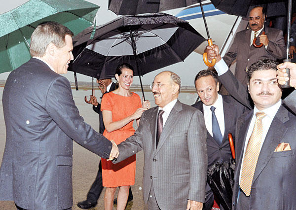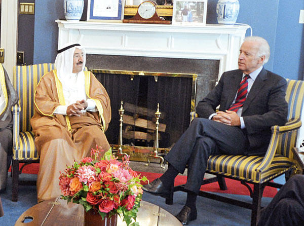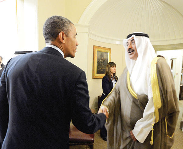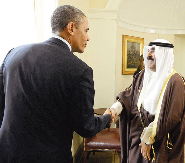 توج سمو الأمير الشيخ صباح الأحمد زيارته الرسمية لواشنطن أمس بلقاء الرئيس الأميركي باراك أوباما، حيث أجريا مباحثات تناولت جميع المواضيع المتعلقة بالعلاقات الثنائية وتوثيقها تحقيقاً لمصلحة البلدين.وأشار سمو الأمير في كلمة له عقب المباحثات إلى أنها شملت ملفات تتعلق بمعتقلي غوانتنامو وتطورات سورية ومصر وأمن الخليج والسلام في الشرق الأوسط.