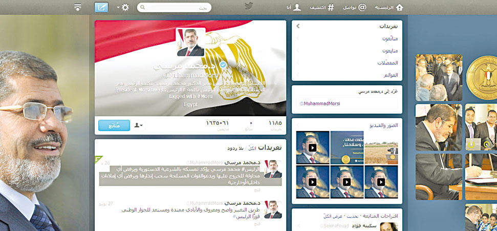 على الرغم من مرور أكثر من 90 يوماً على عزل الرئيس السابق محمد مرسي في 3 يوليو الماضي، مازال الرئيس المحبوس على ذمة التحقيق في قضايا تخابر، يمارس مهامه كرئيس للجمهورية ولكن في العالم الافتراضي فقط، من خلال حسابه الشخصي على موقع التواصل "تويتر" الذي كان قد أنشأه عقب توليه الحكم للتواصل مع الشعب وكان يديره مكتب داخل مؤسسة الرئاسة. وتحظى صفحة المعزول التي تحمل اسم "الدكتور محمد مرسي"، وتوصف بأنها "الحساب الرسمي لرئيس مصر محمد مرسي" بإقبال كبير من متابعي الموقع الإلكتروني، بهدف معرفة أي معلومات عنه، على الرغم من أن الرجل لم يَعُد قادراً على تدوين أية تغريدات جديدة بنفسه، لكن إقبال المتابعين للحساب في زيادة مستمرة.