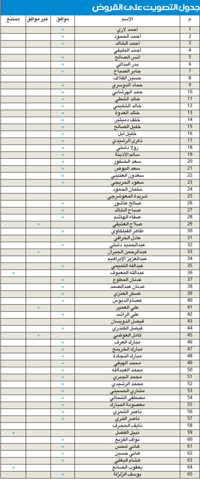وأقر المجلس أيضاً مشروع قانون بتعديل بعض احكام قانون التأمينات الاجتماعية الخاصة بوقف أداء الاشتراكات في التأمين فور بلوغ مدة اشتراك المؤمن عليه المقدار اللازم للاستحقاق والحد الاقصى للمعاش المقر في المداولتين وأحاله الى الحكومة، ووافق على تحديد سن التقاعد بـ 65 عاما وورفعها في بعض المهن الى 75 عاما وفقا لاحكام ديوان الخدمة المدنية في المداولتين وأحاله الى الحكومة.ومن المقرر ان يناقش المجلس في جلسة خاصة اليوم توصيات الجلسة الأمنية و"الوضع الصحي".افتتح رئيس مجلس الامة علي الراشد الجلسة الساعة التاسعة، وتلا الأمين العام أسماء الحضور والمعتذرين. واستكمل المجلس مناقشة التعديلات المقدمة على هيئة القوى العاملة.وطلب مقرر اللجنة الصحية هاني شمس تأجيل مناقشة التقرير بناء على طلب وزيرة الشؤون ومناقشته داخل اللجنة.وطلبت الوزيرة تأجيله لمناقشة التعديلات المقدمة مع اللجنة الصحية، وحيا النائب خليل الصالح الوزيرة على موقفها بحضور اللجنة بشخصها وتمت الموافقة على الطلب.وانتقل المجلس إلى مناقشة تقرير اللجنة المالية بشأن المداولة الثانية لقانون صندوق الاسرة، وبين النائب صالح عاشور ان تقرير اللجنة لم يستلمه.وأوضح رئيس اللجنة المالية يوسف الزلزلة ان التقرير تم توزيعه من قبل رئاسة المجلس بتاريخ 1 ابريل، لافتا الى ان القانون مكون من سبع مواد، وطلب تلاوة المواد جميعها.ميزة الصندوقوأوضح النائب أحمد لاري انه تم "الغاء البنوك الاسلامية، التي كانت ضمن الشرائح المستفيدة من القانون في المداولة الأولى، وهذا يجب ان يكون واضحا لدى الأعضاء، وأنا كعضو لجنة مع بقاء البنوك الإسلامية"، لافتا الى أنه "تم ايضا الغاء الشريحة التي استفادت من صندوق المعسرين، وأوضحت موقفي في اللجنة وأوضحت الان للنواب، والقرار النهائي لهم".وطلب لاري أن يستفيد من اعاد جدولة قرضه من ميزة صندوق الاسرة.وبين النائب علي العمير ان "القانون الذي قدم اليوم، يؤكد بما لا مجال للشك أن هناك اشياء لا يمكن تطبيقها، وقانون اليوم هو قانون جديد لا يتشابه الا في العنوان، وتم الغاء ثلاثة ارباع المستفيدين، ولم تبق منه سوى فئة واحدة، وعلينا ان نكون حذرين في اقرار هذه التشريعات غير الدستورية وغير الشرعية، ولمن قال اننا مع الشريعة فإن الشيخ ناظم المسباح اكد عدم شرعية القانون".وأوضح العمير أن "المنظور الان قانون جديد يجب أن يناقش ويتم تأجيل التصويت عليه، وهذه تشريعات تتعلق بالمال العام، وارجو على الاخ مصطفى الشمالي الا يوافق على هذا القانون الذي به انتهاك للمال العام، رغم الارقام التي تم نشرها بالصحف، لا سيما ان البنك المركزي ما زال متحفظا عليه، فالقانون يتعامل مع مشكلة ليس لها وجود وغير مقبول ان نقر قانونا بهدف التكسب وارضاء شريحة".وتمنى النائب صالح عاشور "تقديم حلول جذرية للقروض حتى يتم اغلاق الموضوع نهائيا، فيجب أن يكون هناك حل يطبق على الجميع ولا نريد ان نقدم تعديلات جديدة او قانونا جديدا لمعالجة قضية القروض".واستغرب عاشور عدم انطباق القانون على شريحة الـ27 الفا التي دخلت صندوق المعسرين، وهم أصل المشكلة.بدوره، اوضح النائب هاني شمس ان مشكلة القروض منذ عشر سنوات، و"شربت مروقها" وجميع الملاحظات التي اعلنها النواب في محلها.من ناحيته، قال النائب خليل الصالح ان "العدل اساس الملك، والبنك المركزي كشف لنا حقيقة المخالفات البنكية على المواطنين، ولقد قدمت مقترحا بقانون أرى فيه تطبيق العدالة والمساءلة الرشيدة".واستغرب عدم وجود ثقافة "انت غلطان" في الكويت، ولابد الا نغفل دور العدالة في موضوع القروض، ويجب ان يكون القانون شاملا، حتى لا نعيب على أنفسنا في المستقبل.وفي السياق، قال النائب نواف الفزيع "لقد حضر 23 نائبا اجتماع المالية يوم الخميس الماضي، وما أثير خلال الاجتماع كان كافيا للرد على ما أثير فهناك رأي شرعي لهيئة تابعة للهيئة العامة للاوقاف أجازت اقرار القانون، فضلا عن ان البنك المركزي أكد من خلال تصويباته أن البنوك خالفت تعلي