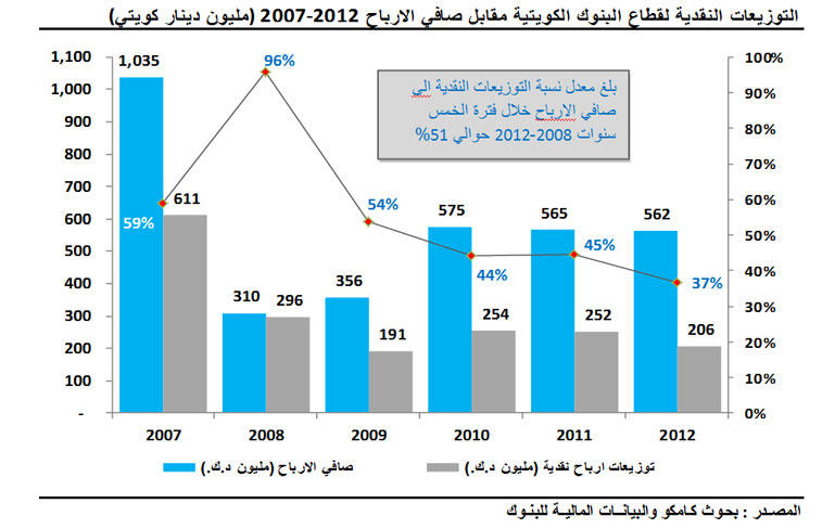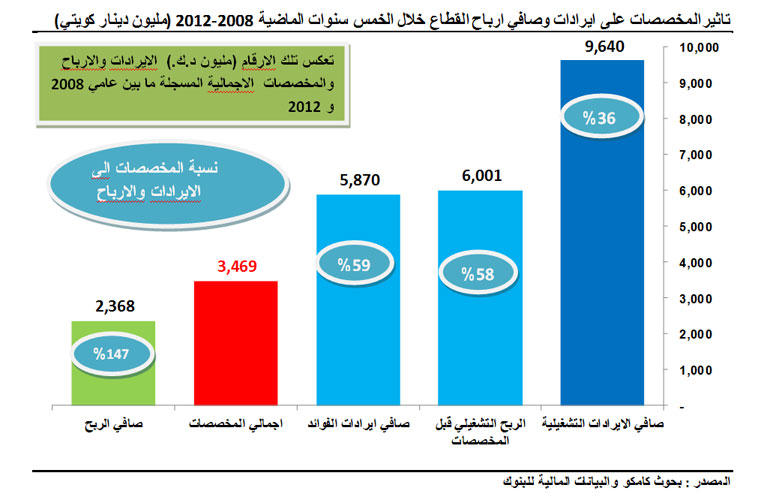 وأوضح انه خلال السنوات الخمس الماضية بلغ حجم المخصصات المحجوزة حوالي 3.5 مليارات دينار واستنزفت ما نسبته 58 في المئة من صافي أرباح التشغيل للقطاع والبالغة ستة مليارات دينار وشكلت ما نسبته 36 في المئة من اجمالي ايرادات القطاع خلال الفترة نفسها والبالغة 9.7 مليارات دينار.ورأى أن ذلك يشكل دليلا واضحا على تأثر القطاع سلبا بالقروض غير المنتظمة التي لا تزال عند مستويات عالية اذ بلغت نهاية عام 2012 حوالي 1.9 مليار دينار أي ما نسبته 5.5 في المئة من اجمالي محفظة القروض لدى القطاع. وذكر ان المؤشر الايجابي «الواضح» هو انخفاض نسبة القروض المتعثرة الى اجمالي القروض بشكل متتال منذ عام 2009 حين بلغت 10.3 في المئة لتنخفض الى 8.6 و6.7 في المئة في نهاية العامين 2010 و2011 على التوالي. نمو طفيفوفي تحليل لبيان الدخل للبنوك الكويتية المدرجة بين ان ايرادات الفوائد شهدت نموا طفيفا خلال عام 2012 بنسبة 2 في المئة لتسجل 1.84 مليار دينار معتبرا هذه النسبة «أفضل» من معدلات النمو السالب خلال العامين 2010 و2009 حين سجلت انخفاضا نسبته 10 و20 في المئة على التوالي وكذلك مقارنة مع عام 2011 حين لم تشهد أي تغيير.وأشار الى الاثر «الايجابي» لعودة النمو في سوق الائتمان على ايرادات البنوك من الفوائد حيث سجلت صافي محفظة القروض لدى البنوك الكويتية نموا «ملحوظا» خلال عام 2012 بلغت نسبته 10 في المئة لتصل الى 31.6 مليار دينار. وقال تقرير (كامكو) ان هذا النمو جاء نتيجة الزيادة في الائتمان مدفوعا بالنمو «الملحوظ» في القروض الاستهلاكية التي ارتفعت بقيمة 1.1 مليار دينار حيث بدأت البنوك اتباع سياسة توزيع المخاطر والاعتماد بشكل اكبر على سوق التجزئة. وأفاد بأن الزيادات في رواتب القطاع العام شكلت الدافع الرئيسي لهذا التوجه، لافتا الى انه في موازاة انخفاض هامش الفائدة ارتفع صافي ايرادات الفوائد بنسبة 2.9 في المئة خلال عام 2012 لتسجل 1.255 مليار دينار.وذكر التقرير ان البنوك نجحت خلال عام 2012 بتعزيز الايرادات من غير الفوائد بنسبة 16.6 في المئة لتسجل 839 مليون دينار وذلك بعد نمو بلغت نسبته 20 في المئة خلال عام 2011 حيث سبقته ثلاث سنوات متتالية من الانخفاض بسبب تراجع حجم الأعمال وخسائر أسواق الأسهم والتذبذب في أسعار صرف العملات الأجنبية. تنويع المصادرواعتبر التقرير ذلك دليلا «واضحا» على جهود البنوك في تنويع مصادر الدخل لديها جغرافيا عن طريق التوسع في الاسواق الخارجية وبالتالي ارتفع صافي الايرادات التشغيلية للقطاع بنسبة 8 في المئة ليصل الى 2.15 مليار دينار «وهو رقم قياسي جديد لم يحققه القطاع من قبل».وبين أن البنوك الكويتية تمكنت خلال عام 2012 من المحافظة على مستويات مقبولة من النمو في أرباح التشغيل قبل خصم المخصصات حيث بلغ اجمالي الربح التشغيلي للقطاع حوالي 1.34 مليار دينار وبنسبة نمو بلغت 10 في المئة مقارنة مع عام 2011. وذكر ان المخصصات المحجوزة مقابل القروض غير المنتظمة لا تزال تضغط على ربحية القطاع وللسنة الخامسة على التوالي حيث ارتفعت المخصصات خلال عام 2012 بنسبة 5 في المئة لتصل الى 688 مليون دينار.وبين تقرير (كامكو) ان القيمة الاجمالية للمخصصات المحتجزة منذ عام 2008 بلغت حوالي 3.5 مليارات دينار «وهو رقم كبير» مقارنة بأرباح وايرادات القطاع حيث شكلت تلك المخصصات ما نسبته حوالي 36 في المئة من اجمالي ايرادات القطاع خلال الفترة بين (2008 - 2012) و58 في المئة من اجمالي أرباح التشغيل خلال الفترة نفسها والبالغة ستة مليارات دينار.واشار الى أن هذا الارتفاع «الملحوظ» في المخصصات خلال عام 2012 جاء بالتزامن مع بقاء القروض غير المنتظمة عند مستويات مرتفعة بلغت 1.9 مليار دينار «رغم انخفاضها عن عام 2011 حين بلغت 2 مليار دينار حيث شطبت البنوك ديونا قديمة وأضافت ديونا جديدة الى قائمة الديون غير المنتظمة». ولفت التقرير الى انخفاض القروض غير المنتظمة من ثلاثة مليارات دينار بنهاية عام 2009 الى 2.49 مليار دينار و1.93 مليار دينار نهاية العام 2010 ومن ثم الى 2 مليار و1.9 مليار دينار نهاية العامين 2011 و 2012 على التوالي.