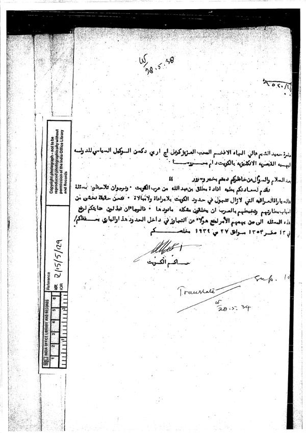 استمرت السيارات العراقية في اختراق الحدود الكويتية ومضايقة عرب الكويت الذين يباشرون رعي جمالهم وأدباشهم في البر قرب الحدود العراقية، ووقعت العديد من الحوادث الصغيرة قبل منتصف الثلاثينيات من القرن الماضي أدت إلى مقتل عدد من الكويتيين وحدوث أضرار بالغة في ممتلكاتهم الحيوانية. وكان الشيخ أحمد الجابر -رحمه الله- يسعى إلى حل هذه المشكلة بالتنسيق مع البريطانيين الذين ترتبط الكويت معهم باتفاقية حماية، من بنودها أن المسائل الخارجية هي من مسؤولية الجانب البريطاني. وكما ذكرنا في الحلقات الماضية فقد قتلت دورية عراقية ناصر بن فهاد القحطاني، واقتادت مرشد البريهي إلى البصرة، وباع أفراد الشرطة 6 بعارين من ممتلكات ناصر ومرشد. وفي حادثة ثانية نشرنا تفاصيلها، أطلقت الشرطة العراقية ست طلقات على مجموعة من الكويتيين في جزيرة "وربة" دون أن تحدث أية إصابات، وفتشتهم بدون وجه حق على جزيرة كويتية. أما الحادثة الثالثة التي نشرنا تفاصيلها فتتعلق بعبدالله السميري، الذي كتب شكوى بخصوص أفراد الشرطة العراقية الذين يخترقون الحدود الكويتية بالسيارات العسكرية ويقومون بمضايقة عرب الكويت المقيمين في الصحراء. واليوم ننشر تفاصيل قصة أخرى من هذه القصص التي وقعت في تلك الفترة، وهي قصة تضمنتها وثيقة كتبها الشيخ أحمد الجابر -رحمه الله- وتاريخها 27 مايو 1934م، تفيد بأن أحد المواطنين الكويتيين قدم إفادة مرفقة مع الرسالة، مشيراً إلى أن السيارات العسكرية العراقية مازالت مستمرة في تعدياتها على الحدود الكويتية، وهو أمر ترفضه الكويت، وأبدى خوفه من أن تنزلق الأمور إلى ما لا يحمد عقباه إذا استمر الأمر بهذا الشكل. وإليكم نص الرسالة كما ورد:"حضرة حميد الشيم عالي الجاه الأفخم المحب العزيز كرنل اج اربي دكسن الوكيل السياسي للدولة البهية القيصرية الإنكليزية بالكويت دام محروساً،،،
