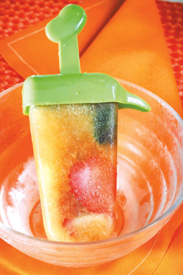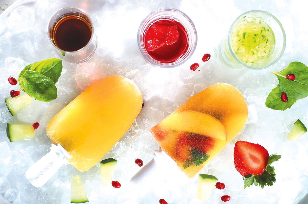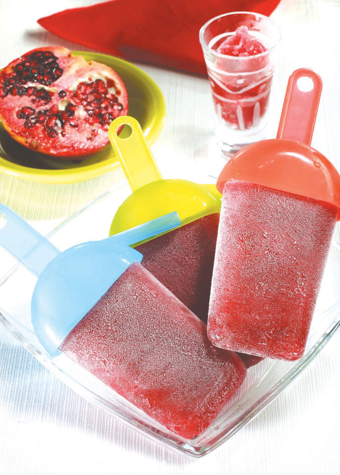 المقادير- كوبان ونصف من الخيار المفروم.- كوب من المشروب الغازي.- نصف كوب من عصير التفاح.الطريقة1. ضعي الخيار والمشروب الغازي في الخلاط واخفقيهما إلى أن يصبح الخليط طرياً.2. اسكبي الخليط في وعاء عبر مصفاة وأعيدي نصف كمية اللب إلى المصفاة ثم أضيفيها في عصير الخيار والمشروب الغازي. اسكبي فوقه عصير التفاح واخفقي الخليط إلى أن يمتزج جيداً ثم اسكبيه في ستة قوالب للمثلجات.3. ضعي القوالب في الثلاجة مدة ثلاث ساعات ثم حركيها جيداً وأدخلي العصي في القوالب ودعيها تتجمّد (لأربع ساعات إضافية) أو طوال الليل.في الحصة: 160 سعرة حرارية (%10 من الدهون)، كمية ضئيلة من الدهون (ما من دهون مشبعة)، خالي من الكولسترول، غرام من الكربوهيدرات، كمية ضئيلة من البروتينات، 2 ملغ من الصوديوم، كمية ضئيلة من الألياف الغذائية.كوكتيل رمان وفانيلا وعصير تفاح (4 )المقادير- نصف عود فانيلا.- ربع كوب من السكر الناعم.- كوب ونصف من عصير الرمان.الطريقة1. انزعي البذور من عود الفانيلا وضعيها مع العود في وعاء يحتوي على سكر ونصف كوب ماء. اغلي الخليط على نار خفيفة حتى يذوب السكر. دعي الخليط على نار هادئة مدة 5 دقائق ثم انزعيه عن النار. دعيه ينتقع مدة 30 دقيقة.2. انزعي عود الفانيلا من السائل وأضيفي إليه عصير الرمان. اسكبي الخليط في أربعة قوالب للمثلجات.3. ضعي القوالب في الثلاجة مدة ساعتين ثم أدخلي فيها العصي ودعيها تتجمد إلى أن تصبح صلبة بالكامل (لأربع ساعات إضافية).في الحصة: 135 سعرة حرارية (%1 من الدهون)، كمية ضئيلة من الدهون (ما من دهون مشبعة)، خالي من الكولسترول، 26 غراماً من الكربوهيدرات، كمية ضئيلة من البروتينات، 11 ملغ من الصوديوم، خالي من الألياف الغذائية.مثلجات إنكليزية صيفية بالفاكهة (6 )المقادير- ربع كوب من السكر الناعم.كوب من الزنجبيل (أو الليموناضة).- ربع كوب من الفراولة المقطعة.- ربع كوب من التفاح المقطع.- 18 ورقة صغيرة من النعناع. الطريقة1. ضعي السكر ونصف كوب ماء في طنجرة واغلي الخليط على نار خفيفة إلى أن يذوب السكر. دعيه يغلي مدة 5 دقائق، ثم انزعيه عن النار.2. أضيفي الزنجبيل أو الليموناضة. دعي الخليط يبرد بالكامل.3. قسمي قطع الفراولة والتفاح وورق النعناع بين ستة قوالب للمثلجات. اسكبي الخليط وأدخلي فيها العصي.4. ضعي القوالب في الثلاجة مدة 6 ساعات، إلى أن تتجمد بالكامل.في الحصة: 76 سعرة حرارية (%1 من الدهون)، كمية ضئيلة من الدهون (ما من دهون مشبعة)، خالي من الكولسترول، 14 غراماً من الكربوهيدرات، كمية ضئيلة من البروتينات، 3 ملغ من الصوديوم، كمية ضئيلة من الألياف الغذائية.كوكتيل «جاليسيتو» (6 )المقادير- نصف كوب من السكر الناعم.- برش حبة ليمون.- ثلث كوب من عصير الليمون (بين 3 و4 حبات ليمون).- كوبان من البطيخ المقطع.الطريقة1. ضعي السكر وبرش الليمون في طنجرة مع كوب ماء ودعي الخليط يغلي على نار خفيفة إلى أن يذوب السكر وتظهر بعض الفقاعات، مدة 5 دقائق، ثم انزعيه عن النار واسكبي فوقه عصير الليمون.2. ضعي قطع البطيخ في الخلاط ثم أضيفي سائل الليمون ورحيق الصبار واخفقي المقادير إلى أن تمتزج جيداً.3. اسكبي الخليط في وعاء وغطيه وضعيه في الثلاجة حتى 6 ساعات وحركيه كل ساعتين. بعد ذلك، أخرجيه من الثلاجة واخفقيه في الخلاط ثم اسكبيه في أكواب. دعيه يذوب قليلاً (مدة 10 دقائق) ثم قدميه.في الحصة: 136 سعرة حرارية (%2 من الدهون)، كمية ضئيلة من الدهون (ما من دهون مشبعة)، خالي من الكولسترول، 24 غراماً من الكربوهيدرات، كمية ضئيلة من البروتينات، 2 ملغ من الصوديوم، كمية ضئيلة من الألياف الغذائية.مثلجات بالعسل (6 )المقادير- ملعقتان كبيرتان من العسل.- كوبان من عصير الزنجبيل.الطريقة1. ضعي العسل في وعاء واسكبي فوقه عصير الزنجبيل بهدوء واحرصي على خفق الخليط جيداً.2. اسكبي الخليط في ستة قوالب للمثلجات وضعيها في الثلاجة. بعد ساعتين، حركي كل قالب جيداً. ثم ثلّجي القوالب لساعتين إضافيتين وحركيها وأدخلي العصي فيها. أعيديها إلى الثلاجة وثلجيها لساعتين إضافيتين إلى أن تصبح صلبة بالكامل.في الحصة: 