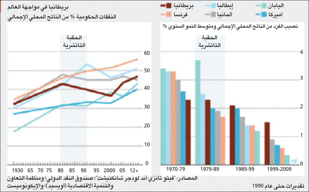 خلال فترة عملها رئيسة للوزراء في بريطانيا بين 1979 و1990 كافحت مارغريت تاتشر بقوة من أجل كبح الإنفاق العام، لكنه ظل عالياً مقارنة بدول مثل الولايات المتحدة. وتمثل إنجازها العميق على الصعيد الاقتصادي في إصلاح أسواق الإنتاج والعمل. وتراجع تأثير الحركات النقابية وتأثيراتها وفتح الباب أمام المنافسة، كما تم إبعاد بارونات النقابات العمالية من المسرح.
