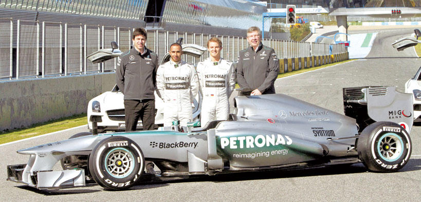 كشف فريق مرسيدس لسباقات سيارات فورمولا-1 امس عن سيارته الجديدة التي سيخوض بها فعاليات الموسم الجديد ببطولة العالم (الجائزة الكبرى) لسباقات فورمولا-1 عام 2013، ولكن السيارة الجديدة لم تكن مفاجأة كاملة بعدما قادها الألماني نيكو روزبرغ فعليا في سباق أقيم امس الاول.وشوهدت السيارة الجديدة "إيه إم جي دبليو 40" فترة قصيرة على مضمار خيريث في مقطع ترويجي مصور للفريق يعلن فيه الراعي الجديد للفريق.