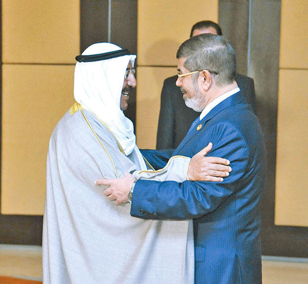 انطلقت أمس فعاليات «القمة الإسلامية» الثانية عشرة، برئاسة الرئيس محمد مرسي، والتي تعد أول قمة إسلامية تستضيفها مصر منذ تأسيس منظمة المؤتمر الإسلامي عام 1969، كما تعد أول قمة دولية تستضيفها القاهرة بعد ثورة 25 يناير.ووسط حضور حاشد تقدمه أمير البلاد الشيخ صباح الأحمد وأمير قطر الشيخ حمد بن خليفة والرؤساء الإيراني أحمدي نجاد والتركي عبدالله غول والسوداني عمر البشير، بدأت الجلسة الافتتاحية بكلمة ترحيبية للرئيس مرسي، أعقبتها كلمة لرئيس جمهورية السنغال رئيس الدورة السابقة للقمة، ماكي سال، طالب فيها بدعم مالي لاستعادة سيادتها المهددة «بمجموعات ارهابية».ثم تم انتخاب أعضاء المكتب التنفيذي للمنظمة، ثم كلمة رئيس الدورة الحالية الرئيس محمد مرسي، أعقبتها كلمة الأمين العام لمنظمة التعاون الإسلامي ثم تلقى ثلاث كلمات نيابة عن المجموعات الرئيسية بالمنظمة «العربية والآسيوية والإفريقية».اجتماعات مستمرةويبحث القادة ورؤساء الوفود والمشاركون في القمة، التي تنهي أعمالها اليوم، عدداً من القضايا المهمة على رأسها الأزمة السورية ومساندة الشعب الفلسطيني ودعم القدس ومشكلة الإسلاموفوبيا وأوضاع الأقليات المسلمة في العديد من دول العالم. وأشاد الرئيس السنغالي، في كلمته، بمبادرات خادم الحرمين الشريفين الملك عبدالله بن عبدالعزيز للتصدي للإرهاب، داعياً القمة لدعم التدخل العسكري الفرنسي في مالي، مطالباً بضروة تبني استراتيجية تعاون شامل من أجل نشر التعليم والثقافة ومحاربة التطرف، منوها أيضا بالدور الذي قامت به قمة داكار لدعم العمل الإسلامي في مختلف المجالات.ولفت الرئيس السنغالي إلى أنه رغم الجهود التي بذلتها رئاسة المنظمة فإن صندوق التبرعات الخاص بالمنظمة جمع 6 مليارات دولار، على الرغم من أن الهدف كان جمع 10 مليارات، داعياً الدول الأعضاء في المنظمة إلى الإسهام في دعم الصندوق بالشكل المنشود، بينما حيا شعوب البلدان التي خاضت عملية تحول ديمقراطية بطريقة سلمية.درس التاريخبدوره، حث الرئيس مرسي المعارضة السورية على ضرورة الإسراع في اتخاذ الخطوات اللازمة لتكون مستعدة لتحمل المسؤولية السياسية من جميع جوانبها، حتى إتمام عملية التغيير السياسي المنشود بإرادة الشعب السوري وحده.ودعا مرسي، في كلمته، كل أطياف المعارضة التي لم تنضم للائتلاف الوطني السوري إلى التنسيق معه (الائتلاف)، وإلى مؤازرة جهوده لطرح رؤية موحدة وشاملة لعملية البناء الديمقراطي لسورية الجديدة.وطالب جميع الدول الأعضاء في منظمة التعاون الإسلامي بدعم الخطوات المهمة التي يتخذها السوريون من أجل توحيد صفوفهم وإقامة الائتلاف الوطني لقوى الثورة والمعارضة، والذي يتخذ من القاهرة مقراً له، حيث تقدم له مصر كل الدعم اللازم ليقوم بمهامه على الوجه الأكمل.وأضاف مرسي أنه «يتعين على النظام الحاكم في سورية أن يقرأ التاريخ ويعي درسه الخالد، وهو أن الشعوب هي الباقية، وأن من يعلون مصالحهم الشخصية فوق مصالح شعوبهم ذاهبون لا محالة»، مؤكداً أن «جهود مصر مستمرة وبدأتها بإطلاق المبادرة الرباعية في قمة مكة المكرمة لإنهاء معاناة الشعب السوري».وأشار إلى أن الأوضاع الإنسانية في سورية بلغت مبلغاً خطيراً، وفي كل يوم يزداد تدهوراً للأسف، مشيراً إلى نزوح أكثر من مليون ونصف المليون سوري من قراهم ومدنهم وباتت أوضاعهم المعيشية بالغة الصعوبة، بينما هاجر مئات الآلاف خارج سورية.وأوضح الرئيس المصري بقوله: «قمت بإصدار تعليمات بمعاملة الأخوة السوريين في مصر معاملة المصريين في تلقي العلاج والالتحاق بالتعليم»، معرباً عن شكره لدول الجوار السوري على ما تبذله من جهود في استقبال الأشقاء السوريين وتقديم العون لهم.جرائم بشعةإلى ذلك، ألقى ولي العهد السعودي الأمير سلمان بن عبدالعزيز كلمة خادم الحرمين الشريفين أمام القمة الإسلامية، أكد فيها أن النظام السوري بقيادة بشار الأسد يرتكب جرائم بشعة ضد الشعب، وأنها وصلت إلى مستويات لا يمكن الصمت عنها.وشدد 