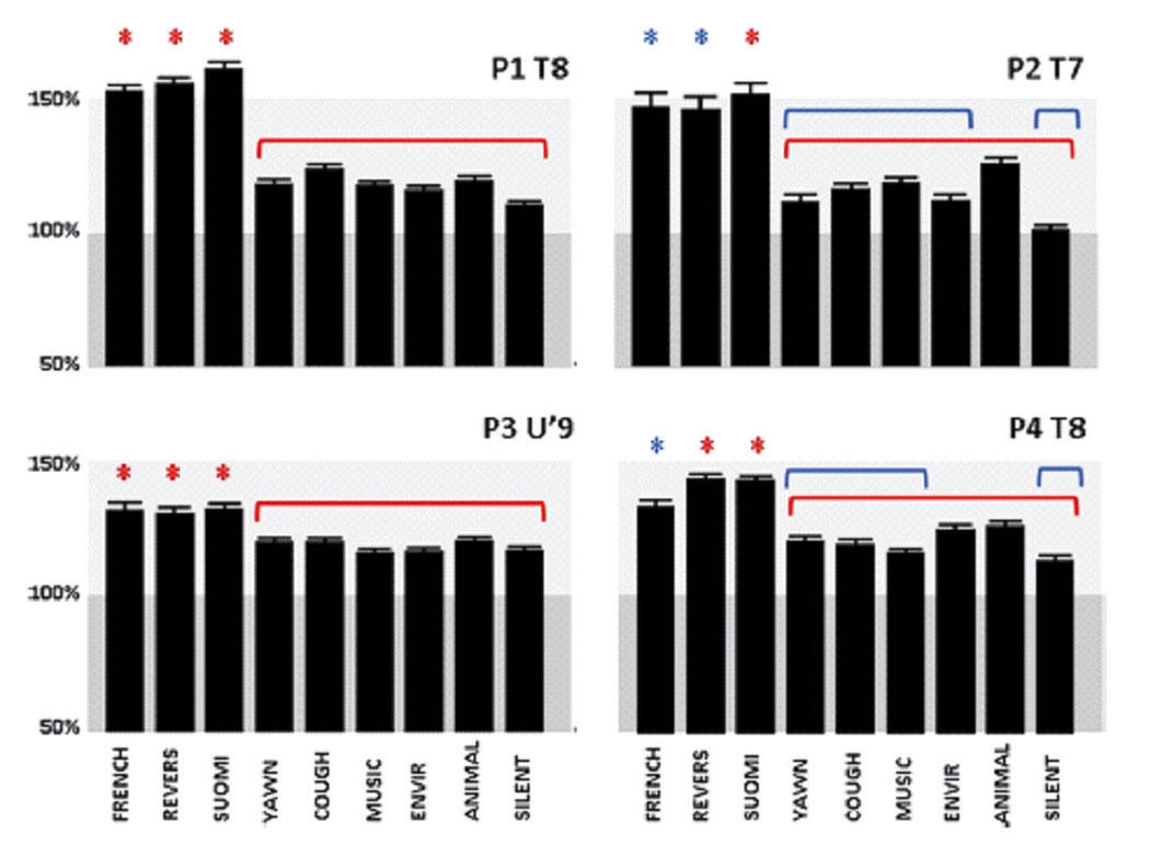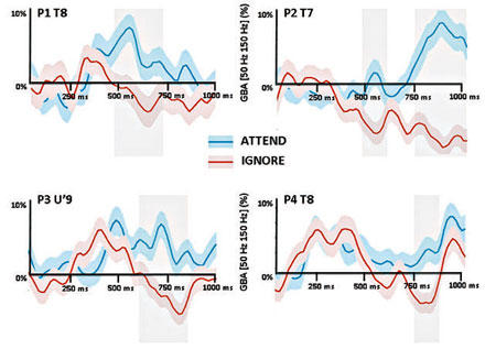 لا شك في أن التصوير بالرنين المغناطيسي الوظيفي ليس كافيًا للإجابة عن هذه الأسئلة. لكنك تستطيع معرفة الجواب إن كنت تملك أقطابًا مزروعة في الأماكن المناسبة. صحيح أن الناس لا يتنقلون وهم يضعون أقطابًا في رؤوسهم، ومن المستبعد أن يتطوعوا للقيام بأمر مماثل لأجل العلم. ولكن ثمة مجموعة صغيرة من الناس تُضطر إلى ذلك. يعاني بعض هؤلاء حالة حادة من صرع الفص الصدغي (temporal lobe epilepsy). وأحد الحلول الأخيرة التي يعتمدها الأطباء لمعالجة هذه الحالات اقتطاع الفصَين الصدغيين. ولكن قبل الإقدام على خطوة مماثلة، من الضروري التأكد من أن النوبات تنتج فعلاً من نشاط الفص الصدغي، ومعرفة الموضع الذي تبدأ فيه هذه النوبات (لا شك في أن الأطباء يريدون الاكتفاء باقتطاع ما هو ضروري فحسب). لذلك يزرعون أقطابًا لتخطيط أمواج الدماغ تحت جمجمة المريض وفوق الفصين الصدغيين لمراقبة نشاطهما. وبما أن هؤلاء المرضى يحملون الأقطاب في مطلق الأحوال، فلا ضرر من المشاركة في دراسة حول القراءة. طلب الباحثون في هذه الدراسة من أربعة أشخاص سبق أن زُرعت أقطاب لتخطيط أمواج الدماغ قرب فصوصهم الصدغية قراءة قصة بصمت والاستماع إلى صوت يعطيهم التوجيهات. وخلال عملية القراءة والاستماع كان الباحثون يسجلون البيانات.يمكنك أن ترى في الرسم البياني أدناه تسجيلات من مناطق السمع الأربع، تسجيل لكل مريض (من المؤسف أن عدد المشاركين في الدراسة اقتصر على أربعة. بما أن هذه حالة نادرة، وعدد مَن يحتاجون إلى علاج جراحي أقل أيضًا). لاحظ أن هذه المناطق من الفص الصدغي تتفاعل كثيرًا مع الكلام (الفرنسية، الفنلندية، والفرنسية المعكوسة)، مقارنة بالأصوات العشوائية، مثل السعال، الموسيقى وأصوات الحيوانات. تُعتبر هذه المنطقة مسؤولة عن الكلمات المكتوبة.لاحظ أن الخطوط الزرقاء (عندما طُلب من المرضى الانتباه) تُظهر تزايد النشاط الكهربائي في هذه المنطقة عندما أعطي المرضى كلمات مكتوبة. وتشكّل هذه قشرة سمعية تتفاعل عادة مع الكلام. ومن هنا استخلص الباحثون أن دماغنا يعتبر، على ما يبدو، الجمل المكتوبة كلامًا.لا تقتصر أهمية الدراسة على أنها تُظهر أن القراءة بصمت تؤدي إلى نشاط كهربائي عالي الوتيرة في المناطق السمعية، فهي تبرهن أيضًا أن هذه المناطق مخصصة لأصوات تنطق بلغة. فلم يظهر هذا النشاط إلا عندما أولى الشخص العمل انتباهًا. لذلك يعتقد الباحثون أن هذه النتائج تدعم فرضية أن كلنا ننتج «صوتًا داخليًّا» عندما نقرأ بصمت، ويزداد الصوت فاعلية عندما نوليه اهتمامًا، ما يوحي أن العملية ليست تلقائية، بل تحدث عندما نعالج بانتباه الكلمات خلال القراءة. لذلك عندما تقرأ بصمت في المرة التالية، تذكر أن الصمت لا يسود داخل دماغك.