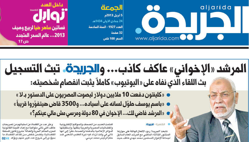• تحريك الدعوى ضد «المرشد السابق» لإهانته القضاة بعد تغاضي «نظام مرسي» عنها • خبراء اتحاد الإذاعة والتلفزيون يؤكدون أن تسجيل الجريدة• الصوتي صحيح