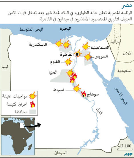 وبينما كانت أم حنان تنهي محادثتها مع ابنتها أثناء تحرك المترو من المحطة، مرددة: "حسبي الله ونعم الوكيل"، نشب خلاف بينها وبين شخص ملتح، كان يستعد للتوجه إلى ميدان مصطفى محمود بضاحية المهندسين، لينضم إلى زملائه الذين احتشدوا هناك بالمئات، واشتبكوا مع قوات الأمن، ما دفع الركاب إلى إجباره على النزول في المحطة التالية. وبدت الشوارع خالية تماما باستثناء البؤر التي تمركز فيها أنصار الجماعة، واشتبكت معهم قوات الأمن، ما أدى إلى عزل مناطق عدة في القاهرة الكبرى، منها مدينة نصر والهرم و6 أكتوبر، بعدما قطع أنصار الرئيس المعزول جميع الطرق والمحاور المرورية الرئيسية، ولأسباب أمنية علقت وزارة النقل حركة القطارات بين المحافظات، في محاولة للحد من توافد الإخوان على العاصمة للانضمام إلى رفاقهم. واضطرت الهيئات الحكومية إلى إغلاق أبوابها منذ الساعات الأولى من صباح أمس، حيث لم يستطع غالبية الموظفين التوجه إلى مقار عملهم، وكذلك أغلقت البنوك أبوابها، بينما شهدت ماكينات الصرف الآلي إقبالا كبيرا من جانب المواطنين لسحب كميات كبيرة من الأموال، تحسبا لاستمرار الوضع فترة طويلة. وشمل الإغلاق عددا كبيرا من المتاجر، التي علق أصحابها العمل حتى إشعار آخر، بينما شهدت فنادق عدة حالة من الطوارئ، بعد أن دفعت وزارة الداخلية بقوات إضافية لتأمين الفنادق، وسط نسب إشغال متدنية منذ 30 يونيو الماضي.