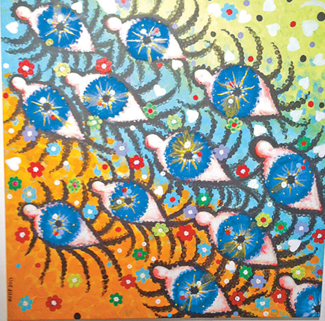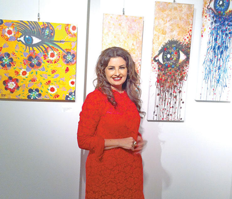 تركز الفنانة عفاف العيسى على الألوان الزاهية في أعمالها، مقدمة رؤية فنية تعتمد على مثلث العين والورود والهلال.