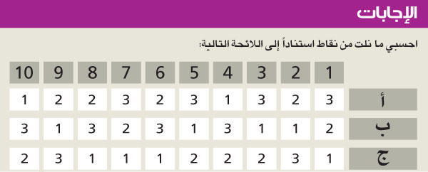-1 طلب منك رئيسك في العمل قبل مغادرة مكتبك بدقائق أن تقومي بعمل طارئ: أ- تعملين طوال الليل إذا تطلب الأمر لإنهائه على أكمل وجه.ب- تنطلقين فوراً بالعمل عليه لينتهي في اليوم التالي.ج- تنتظرين حتى الغد، فقد حان موعد مغادرة المكتب! -2 علمت أن منصباً مهماً شغر في المؤسسة حيث تعملين:أ- ترسلين رسالة خطية إلى المدير ترشحين نفسك من خلالها لهذا المنصب.ب- إنه منصب يفرض مسؤوليات جمة لذلك لا تهتمي بالأمر.ج- تقصدين مباشرة مكتب المدير العام في محاولة لإقناعه أنك جديرة بتولي المنصب.-3 اقترفت إحدى الزميلات خطأً فادحاً في أحد الملفات:أ- تعتقدين أنها لا تتمتع بالكفاءة الضرورية وتعلمين مديرك بالأمر.ب- تصححين الخطأ سراً كي لا تنزعج من تصرفك.ج- تعطينها ملاحظة مباشرة لتصححه بنفسها. -4 ترين في العمل مصدر:أ- متعة.ب- سلطة.ج- نجاح. -5 يدعوك مديرك إلى العشاء إلا أنك مرتبطة بموعد مع صديقك المفضل:أ- تقبلين من دون تردد فها قد سنحت لك الفرصة لتظهري كفاءتك.ب- ترفضين دعوته لأنك منشغلة.ج- تتصلين بصديقك وتتطلبين منه تأجيل موعدكما. -6 توليت منصباً منحك سلطة على عددٍ من الرجال: أ- تعتمدين أسلوب حوار خاص معهم تجنباً لأي خلاف.ب- تضعين النقاط على الحروف فوراً، فأنت الرئيسة هنا.ج- تشعرين بالراحة المطلقة وتخرجين معهم مساءً بعد العمل. -7 لم توافق الإدارة على مشروعك:أ- أمر غير مقبول وتقصدين مديرك شاكية.ب- تعترفين أنك لم تعملي عليه كما يجب.ج- ستقومين بعملٍ أفضل في المرة المقبلة. -8 تمّ تعيين شابة جميلة وذكية في القسم حيث تعملين، تفكرين:أ- أنكما ستؤلفان فريق عملٍ رائعاً.ب- لا بد أن ألزم حذري، إنها منافسة تتمتع بصفات ممتازة.ج- رائع! حظيت بزميلة جديدة أتبادل معها أطراف الحديث أثناء إعداد القهوة. -9 عُرِض عليك منصب أحلامك في منطقةٍ بعيدة: أ- ترفضين لأنك غير مستعدة لتتخلي عن عاداتك والابتعاد عن عائلتك.ب- لم لا إلا أن الموضوع يحتاج إلى تفكير طويل.ج- توافقين فوراً.-10 لا يتوقف أحد زملائك عن إعطاء ملاحظات مزعجة: أ- تتركينه يقول ما يشاء فهو لا يستحق منك أي اهتمام.ب- لا توفرين طريقة لتثبتي له أنك أكثر جدارةً منه.ج- تقولين أن يلزم حدوده ويوقف نكاته السخيفة.النتائجأقل من 15 نقطة: أنت هادئةلا شكّ في أن العمل لا يحتل مكانةً مهمة في حياتك، إلا أنك تحبين أجواءه التي تتيح لك فرصة تبادل أطراف الحديث مع زملائك من دون السعي إلى إبراز أهميتك. تقومين بكلّ ما يُطلب منك ولم تشتكي يوماً من الأمر! ينسابك مركزك تماماً ولا ترغبين في تغييره في الوقت الراهن. 15 – 25 نقطة: أنت مهنيةيعجبك عملك وتحبين أن تستثمري قدراتك وإمكاناتك فيه. تحبين بشكلٍ خاص العمل ضمن مجموعة من دون أن تفقدي قدرتك على العمل باستقلالية. تجمعك بزملائك علاقات ودية وتعرفين كيف تفرضين احترامك وتدفعين الآخرين إلى تقدير عملك. لا يتوانى رؤساؤك عن إظهار تقديرهم لطموحك واندفاعك وفاعليتك. أكثر من 25 نقطة: أنت طموحةتؤمنين بالقول: «أنا أعمل إذاً أنا موجودة». تسخرين كلّ شيء لتنفيذ مشاريعك وتصعدين السلالم سريعاً. أنت محاربة مناضلة لا تخشى أخذ المبادرة أو إدارة فريق عمل معظم أعضائه من الرجال. تعرفين كيف تفرضين نفسك ولكن انتبهي من أن تظهري كامرأة متسلطة تفادياً لأي توتر قد ينشأ ويسبب لك مشاكل قد تضر بمصلحتك وأنت بغنىً عنه.