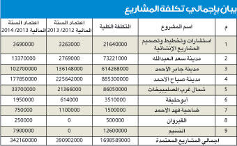 مدينة سعد العبداللهتعتبر مدينة سعد العبدالله احد ابرز المشاريع المتوقع انجازها خلال عام تقريبا، وتشير تقارير "السكنية" الى تقدم في اعمال المشروع الذي يتكون من 2257 بيتا بالاضافة الى المرافق العامة، وقد تم ترسية وتوقيع كافة عقود مكونات المشروع باستثناء مدرسة ثانوية ومراكز الشباب والفتيات واعمال الانارة والطبقة السطحية في قطعة 11 حيث تم طرحها في شهر يناير 2013 ويتوقع الانتهاء منها في شهر سبتمبر 2014.مدينتا جابر وصباح الأحمدويسير العمل حثيثا في مدينة جابر الاحمد حيث تم توقيع قطاع B ويشتمل على 1030 قسيمة وكذلك القطاع A5 ويشتمل على 805 قسائم وتم توزيعها على المواطنين وقد تم البدء في اعمال قطاعات المشروع (N1+N2+N3) وهي تشتمل على 2658 قسيمة و2659 بيتا و710 شقق.وعلى الخطى نفسها يسير العمل في مدينة صباح الاحمد التي تضم 9574 وحدة سكنية ويتركز العمل، بالاضافة الى انجاز القسائم والمباني، على انشاء وانجاز وصيانة الطرق ومواقف السيارات وشبكات خدمات البنية التحتية الرئيسية ومن المتوقع الانتهاء من كامل اعمال المشروع في شهر يناير 2017.مشروع شمال غرب الصليبيخاتويندرج مشروع شمال غرب الصليبيخات ضمن المشاريع العاجلة التي يتوقع الانتهاء من كامل اعمالها في اكتوبر 2014، ليصار الى توزيع الوحدات السكنية الـ1736 على اصحابها، مع الاشارة الى ان اعمال السنة الحالية تتلخص بالاضافة الى مواصلة اعمال البناء، في استكمال استصلاح التربة وانجاز المرافق العامة لاسيما الطرق ومواقف السيارات وشبكات خدمات البنية التحتية.منطقة أبو حليفةوعلى الوتيرة نفسها يسير المشروع السكني في منطقة أبو حليفة والذي يتكون من 171 قسيمة بالاضافة الى المرافق العامة وقد طرح المشروع حديثا وفق البرنامج الزمني للخطة الخمسية الثامنة ومن المتوقع الانتهاء من كامل اعماله في شهر ديسمبر 2014. ضاحية فهد الأحمديتكون المشروع من اعمال الطبقة السطحية وقد طرح في شهر نوفمبر 2012 وفق البرنامج الزمني للخطة الخمسية الثامنة ومن المتوقع الانتهاء من كامل اعمال المشروع في شهر اكتوبر 2013.ضاحية النسيميتكون المشروع من اعمال تحديد وتثبيت اركان 430 قسيمة في قطعة 3 و263 قسيمة في قطعة 4 والمباني العامة، وقد طرح المشروع في شهر يناير 2013 وفق البرنامج الزمني للخطة الخمسية الثامنة ومن المتوقع الانتهاء منه في شهر يونيو 2015.ضاحية القيروانيتكون المشروع من اعمال تمديد كيبلات لـ370 قسيمة وجرى طرحه في شهر اكتوبر 2012 وفق البرنامج الزمني للخطة الثامنة ومن المتوقع الانتهاء من كامل اعمال المشروع في اغسطس 2013.إيرادات المؤسسة في 2013/2014ذكرت المؤسسة العامة للرعاية السكنية ان ايرادات المؤسسة المتوقع تحقيقها خلال السنة المالية 2013/2014 تقدر بـ3 ملايين دينار بزيادة قدرها 1.5 مليون دينار وبنسبة 99.3 في المئة مقارنة بالتقديرات المعتمدة للسنة المالية 2012/2013 والبالغة 1.52 مليون دينار.وقالت المؤسسة في دراسة اعدتها، حصلت "الجريدة" على نسخة منها، ان زيادة الايرادات تعود الى تحصيل غرامات وجزاءات وتكاليف اشراف وقد بني التقدير على دراسة جميع العقود المتوقع ان تنتهي في السنة المالية 20313/2014 والمتوقع تأخرها ان تفرض عليها غرامة تاخير. بينما جاءت ايرادات المبيعات من خلال التقدير على اساس الاسترشاد بمتوسط المحصل الفعلي للسنوات السابقة.وتتضمن الايرادات ايضا ايرادات اخرى غير نقدية تنشأ بسبب اجراء تسويات قيدية نتيجة تصفية لبعض المبالغ وتحصيل قيمة بدل الايجار عن السنوات السابقة والتي صرفت بدون وجه حق على المواطنين المنتفعين ببدل الايجار.