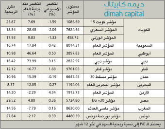 قال تقرير «ديمه كابيتال» الأسبوعي ان أسواق المال في دول مجلس التعاون الخليجي أقفلت الأسبوع الماضي محققة عوائد مختلفة، حيث كان مؤشر سوق دبي المالي الأفضل أداء بارتفاعه بنسبة 3.15 في المئة خلال تداولات الأسبوع بينما كان المؤشر السعري لسوق الكويت للأوراق المالية أكبر المتراجعين بانخفاضة بنسبة 2.09 في المئة، وفي ما يلي التفاصيل: شهد الأسبوع الماضي سلسلة من الأخبار المتعلقة بالوضع الحالي للقطاعات الاقتصادية في أسواق دول مجلس التعاون الخليجي مجتمعة والتوقعات المستقبلية لها. ووفقاً لتقرير تم نشره خلال هذا الأسبوع فإن من المتوقع أن يرتفع الإنفاق الرأسمالي لحكومات دول مجلس التعاون الخليجي خلال العام الحالي بنسبة 8.2 في المئة بالمقارنة مع عام 2012.