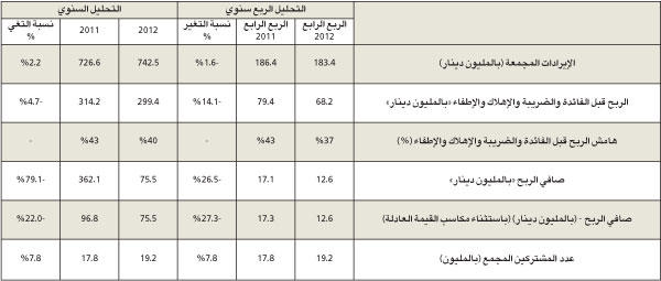 ارتفع عدد عملاء «الوطنية للاتصالات» مع نهاية سنة 2012 إلى 2.03 مليون عميل بزيادة 3.8 في المئة مقارنة بسنة 2011، في حين بلغت الإيرادات 220.8 مليون دينار (785.3 مليون دولار)، مقارنة بـ 243.6 مليون دينار (866.4 مليون دولار) في 2011، أي بانخفاض نسبته 9.4 في المئة.