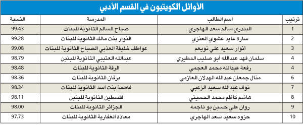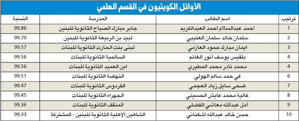 • الأولى السورية بروج عامر مسكين بـ 99.95% وأول الكويتيين أحمد العبدالكريم بـ 99.86%