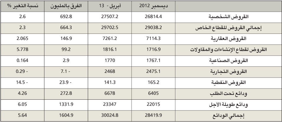 ارتفع إجمالي القروض التي تمنحها البنوك إلى القطاع الخاص بنسبة 2.3 في المئة وبقيمة 664.3 مليون دينار لترتفع من 29.038 مليار دينار إلى 29.702 مليار دينار نهاية شهر ابريل، ولعل السبب الاكبر لهذه الزيادة هو استمرار ارتفاع رصيد قروض البنوك لقطاع الافراد والذي شهد ارتفاعاً خلال هذه الفترة بلغ 2.6 في المئة وبقيمة 692.8 مليون دينار لترتفع تمويلات الافراد من 26.814 مليار دينار إلى 27.5 مليار دينار.وشهدت ودائع القطاع الخاص ارتفاعاً ملحوظاً لدى البنوك الكويتية منذ بداية العام الجاري وحتى نهاية شهر ابريل الماضي، بنسبة بلغت 5.6 في المئة لتزيد من 28.419 مليار دينار إلى 30 مليار دينار بزيادة قدرها 1.6 مليار دينار تقريبا، حيث ارتفعت الودائع تحت الطلب بنسبة 4.25 في المئة لتزيد من 6.405 مليارات دينار إلى 6.678 مليارات دينار بزيادة 272.8 مليون دينار، كما زادت الودائع طويلة الاجل بقيمة 1.331 مليار دينار وبنسبة 6 في المئة لترتفع من 2.2015 مليار دينار الى 2.3347 مليار دينار. وذكرت مصادر مصرفية أن هذه الزيادة في استقبال الودائع جاءت بعد نجاح البنوك في توظيف جزء من سيولتها بزيادة تقديم خدماتها الائتمانية إلى عملائها من الافراد والشركات التي تعمل في القطاعات التشغيلية مثل الصناعة والعقار والتي استطاعت توفير ضمانات وأصول تعتبر جيدة بالنسبة للبنوك.