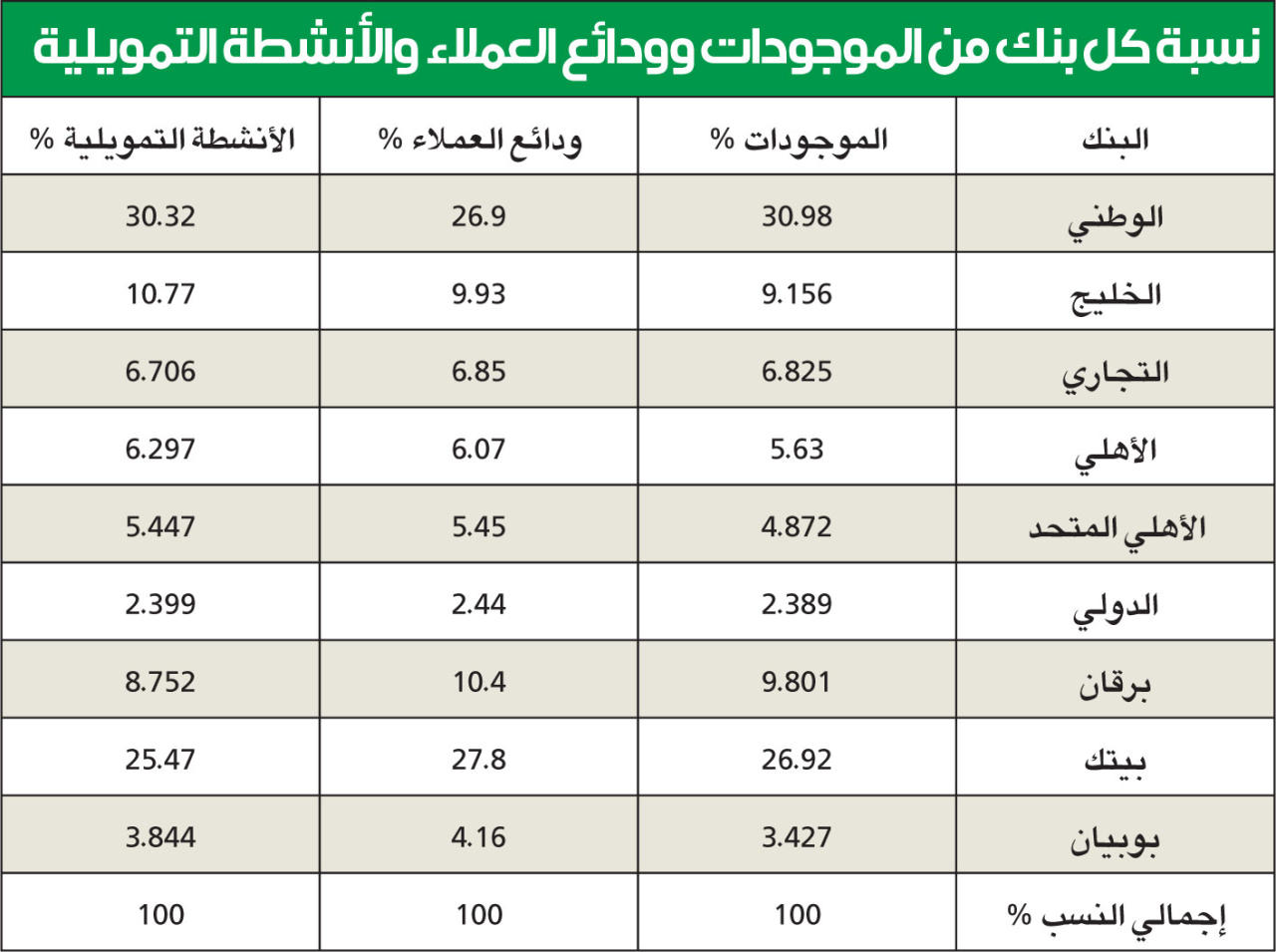 شهدت الاشهر التسعة الاولى من عام 2012 ارتفاعاً ملحوظاً في موجودات البنوك المحلية بلغت نسبته 8.7 في المئة وبقيمة 4.228 مليار دينار لتصل إلى 52.75 مليار دينار مقارنة بـ48.52 مليار دينار كما في نهاية 2011، كما ارتفعت ودائع العملاء بنسبة 8 في المئة وبقيمة 2.4 مليار دينار، لترتفع من 29.73 مليار دينار إلى 32.13 مليار دينار، وزادت ايضاً الانشطة التمويلية للبنوك بنسبة 10.82 في المئة وبقيمة 3.1 مليارات دينار لترتفع من 28.66 مليار دينار إلى 31.76 مليار دينار.ومن حيث البنوك الأعلى في الموجودات، تصدر بنك الكويتي الوطني باقي البنوك بقيمة 16.34 مليار دينار وباستحواذه على 31 في المئة من اجمالي موجودات القطاع، تلاه بيت التمويل الكويتي باستحواذه على 27 في المئة وبقيمة 14.2 مليار دينار، ثم بنك برقان بموجودات قيمتها 5.17 مليارات دينار وبنسبة 9.8 في المئة ثم بنك الخليج بقيمة 4.83 مليارات دينار وبنسبة 9.15 في المئة ثم البنك التجاري بنسبة 6.8 في المئة وبقيمة 3.6 مليارات دينار والبنك الاهلي بنسبة 5.63 في المئة وبقيمة 2.97 مليار دينار، والاهلي المتحد بنسبة 4.87 في المئة وبقيمة 2.57 مليار دينار، وبوبيان بنسبة 3.42 في المئة وبقيمة 1.8 مليار دينار، وأخيرا الدولي بنسبة 2.38 في المئة وبقيمة 1.26 مليار دينار. الأنشطة التمويليةوتصدر الوطني ايضاً باقي البنوك باستحواذه على 30.5 في المئة من اجمالي الانشطة التمويلية للقطاع المصرفي بقيمة 9.63 مليارات دينار، تلاه بيت التمويل بقيمة 8 مليارات دينار وبنسبة 25.5 في المئة ثم بنك الخليج بنسبة 10.77 في المئة وبقيمة 3.42 مليارات دينار، وبنك برقان بنسبة 8.7 في المئة وبقيمة 2.78 مليار دينار، والبنك التجاري بقيمة 2.13 مليار دينار وبنسبة 6.7 في المئة والبنك الاهلي بنسبة 6.3 في المئة وبقيمة ملياري دينار، والبنك الاهلي المتحد بنسبة 5.44 في المئة وبقيمة 1.73 مليار دينار، ثم بنك بوبيان بنسبة 3.844 في المئة وبقيمة 1.221 مليار دينار وأخيراً بنك الكويت الدولي بنسبة 2.4 في المئة وبقيمة 762 مليون دينار.بينما جاء بيت التمويل الكويتي في مقدمة البنوك من حيث ودائع العملاء، باستحواذه على 27.8 في المئة من اجمالي ودائع العملاء، بقيمة 8.94 مليارات دينار تلاه بنك الكويت الوطني بنسبة 27 في المئة وبقيمة 8.65 مليارات دينار ثم بنك برقان بنسبة 10.4 في المئة وبقيمة 3.33 مليارات دينار، وبنك الخليج بنسبة 9.93 في المئة وبقيمة 3.19 مليارات دينار والبنك التجاري بنسبة 6.85 في المئة وبقيمة 2.25 مليار دينار، والبنك الاهلي بنسبة 6 في المئة وبقيمة 1.95 مليار دينار والاهلي المتحد بنسبة 5.45 في المئة وبقيمة 1.75 مليار دينار، وبنك بوبيان بنسبة 4.16 في المئة وبقيمة 1.338 مليار دينار واخيراً الدولي بنسبة 2.44 في المئة وبقيمة 784 مليون دينار.