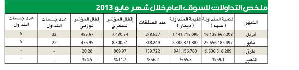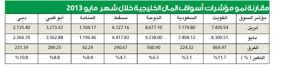 استطاع المؤشر السعري لسوق الكويت أن يضرب 8 حواجز مئوية في مايو الماضي، وبدأ بالتاسع، لكنه لم يصمد فوقه وفقده في آخر جلسة في الشهر، وبقي على مكاسب بنسبة 11.7 في المئة، أي ما يعادل 869.97 نقطة وضعته عند مستوى 8300.51 نقطة.قاد المؤشر السعري لسوق الكويت للاوراق المالية بقية اسواق منطقة الخليج العربي التي انتهت شهر مايو باللون الاخضر، بمكاسب متباينة وكانت ارباح معظمها كبيرة.وتمكن مؤشر سوق الكويت السعري الذي كان الاول خليجيا الصعود بنسبة 11.7 في المئة تلاه مؤشر سوق دبي محققا 10.8 في المئة، فيما كانت مكاسب ابوظبي والمنامة متقاربة بنسبة 8.8 و8.4 في المئة على التوالي وانفرد سوق الدوحة بتحقيق 6.5 في المئة، فيما ارتفع مسقط بنسبة 4.7 في المئة، والمكاسب الادنى من نصيب السوق الاكبر عربيا وهو السعودي وبنسبة لم تتجاوز 3.1 في المئة فقط.الكويتي... قفزات كبيرةاستطاع المؤشر السعري لسوق الكويت للاوراق المالية أن يضرب 8 حواجز مئوية وبدأ بالتاسع لكنه لم يصمد فوقه وفقده في آخر جلسة في الشهر وبقي على مكاسب بنسبة 11.7 في المئة اي ما يعادل 869.97 نقطة وضعته عند مستوى 8300.51 نقطة رغم عمليات جني الارباح التي سجلها خلال ست جلسات خلال الشهر لتقارب مكاسبه لهذا العام 40 في المئة.كما سجلت مؤشراته الوزنية ارتفاعا لكنها ضعيفة قياسا بما حقق السعري وربح الوزني 4.5 في المئة اي 20 نقطة تقريبا ليقفل عند مستوى 475.95 نقطة فيما سجل كويت 15 مستوا جديدا عند 1111 نقطة رابحا 2.8 في المة هذا الشهر ليكمل نسبة 10 في المئة هذا العام، كما قفزت قيمته السوقية بنسبة 4.3 في المئة اي حوالي 1.3 مليار دينار لتقارب 32 مليار دينار وهي اعلى قيمة له منذ فترة اكثر من ثلاثة اعوام سابقة. وشهدت حركة تداولات مايو ارتفاعا كبيرا بلغ 60 في المئة للنشاط و65.3 في المئة بالنسبة للسيولة و56.2 للصفقات وهو ما يشير الى تدفق مستمر للسيولة ومستثمرون او مضاربون جدد يزيدون مع كل ارتفاع للسوق.سوقا الإماراتلا يشبه السوق الكويتي خليجيا خلال هذا العام سوى سوقي الامارات دبي وابو ظبي ليتبادلا القيادة الاسبوعية خليجيا، ونجح دبي بالتفوق على البقية عدا الكويتي لتصل مكاسب شهر مايو 10.8 في المئة مسجلا اعلى مستوياته منذ عام 2008 مقفلا عند مستوى 2336 نقطة مضيفا 231 نقطة، كما بلغت مكاسب ابو ظبي 289.25 نقطة ليبلغ مستوى 3562.88 نقطة وهي اعلى نقطة يبلغها منذ نشوب الازمة المالية العالمية.المنامة والدوحةاستطاع مؤشر سوق المنامة اللحاق سريعا باسواق المنطقة بعد تراجعات حادة حققها حتى نهاية العام الماضي وكان الفضل لذلك مكاسب قطاع البنوك وشركات الاستثمار هناك وقفز خلال شهر مايو بنسبة مريحة كانت 8.4 في المئة ليبلغ مستوى 1196.46 نقطة محققا نموا كبيرا بـ92.29 نقطة.كما استطاع سوق الدوحة ان يعدل من مساره الذي انتهجه خلال شهر ابريل ويستعيد نغمة المكاسب التي دفعت به الى اعلى مستوياته عند 9238 نقطة بنسبة 6.5 في المئة مرتفعا بـ560.9 نقطة جلها خلال النصف الثاني من الشهر المنصرم.السعودي واللحظات الأخيرةبعد خسائر معاكسة لاتجاه معظم اسواق العالم واسواق المنطقة كان معظمها بسبب ارتباط مؤشر تداول بمؤشر قطاع البتروكيماويات الذي تأثر بتراجع اسعار النفط باقل من 100 دولار، عاد النمو مؤخرا الى سوق الاسهم السعودية خلال آخر اسبوعين من شهر مايو ليعوض خسائره ويقفل عند مكاسب هي الادنى خليجيا بنسبة 3.1 في المئة فقط ليقفل عند مستوى 7404.12 نقاط محققا 224.32 نقطة خضراء.