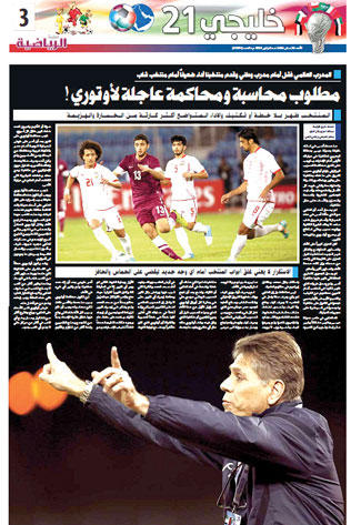 وكان تركيز الاعلام القطري على اوتوري، فحمله البعض مسؤولية الخسارة والاداء المتواضع، في حين انتقد البعض الاخر اللاعبين «الذين لم يصبحوا يصلحون لتمثيل الكرة القطرية».وكتبت «الراية» على صدر صفحتها الاولى «من اولها يا العنابي»، واضافت «بداية محبطة وثلاثية تكشف الاوضاع السلبية»، ووجهت انتقادا عنيفا الى اوتوري «وطالبت بمحاكمته بعد ان فشل في قيادة المنتخب امام فريق شاب بقيادة مدرب وطني»، وقالت ايضا «ان المنتخب ظهر بلا خطة وبلا تكتيك».وعنونت الوطن «بداية تفشل وبلا هوية»، واشارت الى ان المنتخب «خسر من 3 اخطاء دفاعية امام الامارات»، اما الشرق فعنونت «العنابي صدمنا»، ولم تبتعد صحيفة العرب كثيرا فكتبت «منتخبنا محبط». من جهته، أعلن اوتوري أنه يتحمل مسؤولية الخسارة قائلا «لم نؤد في لقاء الامارات جيدا سواء بصورة فردية او جماعية، وفي المقابل لعب المنتخب الاماراتي جيدا وكان الافضل في اللقاء وأهنئه على الاداء والفوز».واضاف «لم نلعب من قبل بهذه الطريقة السيئة والتي لم اتوقعها ومسؤوليتي الآن ان ابحث عن حلول للاخطاء التي حدثت في اللقاء قبل خوض مباراة عمان المقبلة».وعن سبب هبوط المستوى رغم البداية الجيدة وتسجيل هدف السبق قال اتوري «للاسف فقدنا التركيز لفترة طويلة في اللقاء حيث ان الاهداف الثلاثة التي سجلها المنتخب الاماراتي تظهر، فالهدف الاول من ركلة ثابتة والثاني من تمريرة عرضية والثالث من ركلة ركنية، وفي الكرات الثلاث العنابي فقد التركيز وهذا السيناريو الذي حدث في لقاء كوريا الجنوبية في تصفيات المونديال».وأوضح «دائما اقف في الواجهة وادافع عن اللاعبين وهذا لا يمنعني من القول انهم لم يلعبوا بالصورة المطلوبة، لكن علينا ان نتدارك ذلك قبل اللقاء المقبل».(أ ف ب)