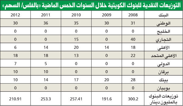 • «الوطني» و«بيتك» الأكثر توزيعاً... وثلاثة بنوك تمتنع • 2008 شهد أعلى التوزيعات خلال خمس سنوات