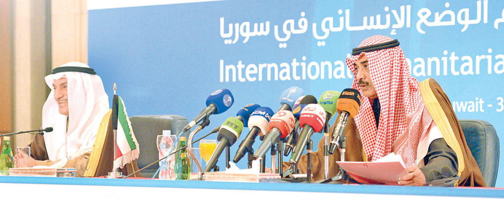 المساعدات الإنسانيةوفي ردوده على اسئلة الصحافيين قال الخالد ان "هذا المؤتمر مخصص للمساعدات الانسانية"، لافتا الى "وجود اكثر من مسار للقضية السورية والجميع يعلم ان العالم بأسره منشغل بالوضع السوري حاليا، وان جميع الاجتماعات مخصصة لبنود اساسية حول الازمة السورية بمسار يعالج الاحتياجات الانسانية الملحة داخليا وخارجيا، لان السوريين يعيشون وضعا انسانيا صعبا واعداد كبيرة منهم تنشد الامن والامان".وعن الدور الذي تقوم به الدول العربية حيال الازمة السورية أوضح الخالد ان "الازمة السورية بند اساسي في اجتماعات دول مجلس التعاون الخليجي والجامعة العربية وكذلك بند اساسي في مجلس حقوق الانسان"، معربا عن امله ان يتحمل مجلس الامن مسؤولياته تجاه الامن والسلم الدوليين، وأن يخرج اجتماع الاخضر الابراهيمي مع دول دائمة العضوية في نيويورك بتصور يعجل بحل الازمة السورية عبر مجلس الامن.وردا عن سؤال حول كيفية ايصال المساعدات للنازحيين السوريين، قال ان "الامر متروك للدول المانحة في توجيه هذه المنح عبر وكالات متخصصة او هيئات شعبية او رسمية لديها"، مؤكدا ان "كل دولة مسؤولة عن الطريقة التي تراها مناسبة لايصال تلك المساعدات".النظام السوريوعما اذا كانت الدول التي تدعم النظام السوري مدعوة الى المؤتمر، ذكر الخالد ان "الدول كلها مجمعة على مساعدة الشعب السوري بغض النظر عن مواقفها السياسية من الازمة، بما فيها النظام السوري الذي سمح للمنظمات بأن توصل المساعدات للمحتاجين، فالجميع يتفق على وجود حاجة ملحة وضرورية لمساعدة الشعب السوري"، مشيرا الى أن "امين عام الامم المتحدة هو الذي وجه الدعوات الى جميع الاطراف لحضور المؤتمر وبالتالي هو من يجب ان يوجه له سؤال عن عدم دعوة الائتلاف الوطني السوري".وأكد الخالد مشاركة ايران في المؤتمر على مستوى مساعد وزير الخارجية، مشيرا الى ان الدول العربية اعترفت بالائتلاف السوري واتفقت خلال اجتماع مراكش على ان يكون للائتلاف دور في المساعدات الانسانية. وردا على سؤال عما اذا كانت هناك آلية لالزام الدول بدفع تعهداتها، اشار الخالد الى انه كلما كان هناك مؤتمر للمانحين كان هناك التزام وتنفيذ، وأن "مكتب الامين العام للامم المتحدة يتابع الامر، وأنا على ثقة بأن كل الدول ستفي بالتزاماتها"، لافتا الى أن الامين العام للامم المتحدة بان كي مون لم يوجه دعوة للنظام السوري او المعارضة السورية.الدول المانحةوعن كيفية ايصال المساعدات، بين الخالد ان "هذه مهمة مساعدة الامين العام المنسق للشؤون الانسانية فاليري اموس التي زارت سورية قبل يومين واطلعت على عمل المنظمات الانسانية العاملة على الارض في سورية"، لافتا الى انها "أعدت تقريرا مفصلا عن الوضع هناك وستعرضه على الدول المشاركة في المؤتمر لدراسة كيفية تقديم المساعدات".وعن مستقبل الازمة السورية، أشار الخالد الى تصريح سابق للمبعوث المشترك للامم المتحدة والجامعة العربية الاخضر الابراهيمي، الذي حذر فيه من انزلاق سورية الى دولة فاشلة يسود فيها السلاح والتهريب وامراء الحرب والمخدرات والتطرف، لافتا الى ان "هذا ما كنا نحذر منه منذ اندلاع الثورة فيها بألا تنزلق البلاد الى حرب اهلية؛ لان الخطر ليس على الشعب السوري بل ستكون هناك افرازات كبيرة على المنطقة بأسرها"، مؤكدا حرص الدول المانحة على ان يكون هناك حل يحقق تطلعات الشعب السوري ويجنب سورية الكارثة المتوقعة.وأوضح ان الكويت اكدت أن "مساعداتنا للسوريين تقوم على مسارين هما دعم مسار الحل السياسي في سورية بما يحقق تطلعات الشعب السوري، والمسار الثاني هو المساعدات الانسانية الملحة للشعب السوري".أوضاع النازحينوذكر الخالد ان امين عام الجامعة العربية نبيل العربي سيعرض تقريرا حول اوضاع النازحين السوريين في الاردن والعراق ولبنان وتركيا اعده فريق من الجامعة العربية، مشيرا الى ان الحضور العالي المستوى للاردن ولبنان سيعطي فرصة كبيرة للوفود المشاركة للوقوف على الاحتياجات والوضع القائم في ا