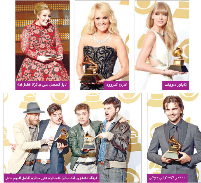 وزعت جوائز غرامي الموسيقية الليلة الماضية وذهبت أكبر الجوائز، في الحفل الذي يعد أهم ليلة لصناعة الموسيقى، الى المغني الأسترالي الشاب جوتي والثلاثي (فان) من نيويورك وفرقة الموسيقى الشعبية البريطانية «مامفورد آند سانز».وخلال ليلة كرمت في الأغلب الموسيقيين الشبان والأقل شهرة على حساب قدامى النجوم المشهورين، حصلت فرقة مامفورد آند سانز على جائزتين من جوائز غرامي، من بينهما جائزة أفضل ألبوم عن ألبوم «بابل».
