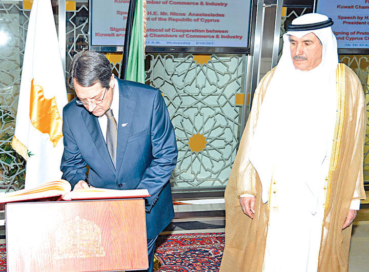 من جهته، أكد الرئيس القبرصي العلاقات الوطيدة بين الكويت وقبرص، موضحا أنه رغم أن العلاقات الدبلوماسية بين الكويت وقبرص تأسست رسميا على مستوى السفراء في عام 2005، لكنها هدفت الى اضفاء الطابع الرسمي وتعزيز العلاقات الوطيدة بين البلدين.تفاعل مستمروأضاف أن «غرفة التجارة والصناعة في البلدين والجمعيات المهنية والهيئات مثل جمعية قبرص في مجلس التعاون الخليجي، والشبكة الواسعة من التعاون التي تأسست عبر التفاعل المستمر منذ سنين في مجالات الأعمال والتجارة والاستثمار، وتوضيح ميزة قبرص التنافسية في قطاع الخدمات المالية، وامكانية تحسين علاقاتنا الاقتصادية والتجارية والاستثمارية». وشدد على ضرورة العمل في الوقت نفسه على اكتشاف احتياطيات الغاز الطبيعي ضمن منطقة قبرص الحصرية الاقتصادية التي تشكل امكانات ضخمة للاستثمار والتعاون في قطاع الطاقة، والتي شكلت أخيرا حافزا جديدا نحو تشجيع الفرص بين قبرص والشركات الأجنبية.وبين ان «هذا يمثل أهمية أكبر عندما ننظر الى قرار الحكومة، والالتزام الراسخ بإقامة محطة الغاز المسال بغية تلبية احتياجات اكتشاف الأوفشور وانتاج الغاز والنفط لدينا، وجعل قبرص وجهة طاقة اقليمية».وأشار إلى وجود فرص واعدة للنمو أيضا ضمن العديد من القطاعات الاخرى، مثل السياحة والملاحة ومشاريع التنمية الكبيرة والتعليم والصحة والأبحاث ومصادر الطاقة المتجددة.بيانات تجاريةواستعرض الرئيس القبرصي بعض البيانات والارقام الخاصة بالعلاقات التجارية بين البلدين، لافتا إلى أن حجم التجارة بين الكويت وقبرص تضاعف خلال العقد المنصرم أكثر من 6 أمثال، ليصل الى نحو 54 مليون دولار في 2012، وبلغت صادرات الكويت الى قبرص أكثر من 14 ضعفا، من نحو 3 ملايين دولار في 2002 الى نحو 44 مليونا في 2012.وأعرب عن امنياته في نجاح الزيارة في تحسين الشراكة الاقتصادية، وتحديد عدد من المبادرات التجارية المشتركة الجديدة، اضافة الى مجالات جديدة للتعاون في المستقبل، مؤكدا حرص حكومته على تقديم كل مساعدة لازمة من أجل تحقيق هذه الغاية، كما أنها ستعمل على تسهيل أي نشاط تجاري واستثماري يأتي من الكويت.