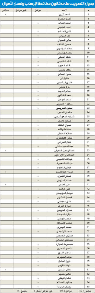 أقر مجلس الأمة في جلسته أمس قانون مكافحة غسل الأموال وتمويل الارهاب في المداولة الثانية واحاله الى الحكومة، واكتفى بإقرار قانون إنشاء الهيئة العامة للغذاء في المداولة الأولى، ورفض طلب الوزيرة رولا دشتي استثناء القانون من المادة 104 والتصويت عليه في المداولة الثانية.وبناء على طلب لجنة الشؤون الصحية والاجتماعية والعمل كلف المجلس ديوان المحاسبة اعداد دراسة عن العلاج بالخارج خلال ثلاثة اشهر وذلك عن السنتين الماليتين (2011 - 2012/2012 - 2013) وتزويد اللجنة بها، وتمديد المهلة الممنوحة للجنة الصحية لتقديم تقرير بشأن وضع المستشفيات الحكومية والتأمين الصحي للكويتيين وخصخصة الخدمات الصحية ثلاثة اشهر.
