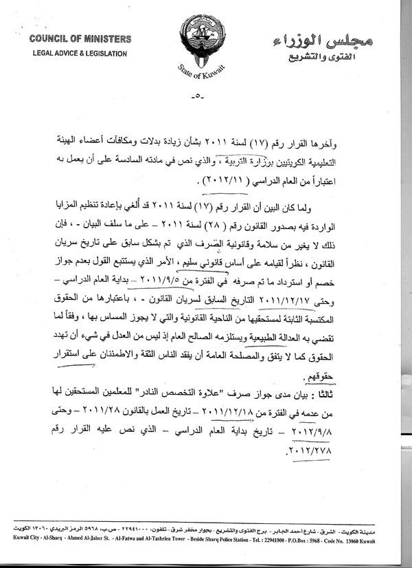 بواقع 150 ديناراً للمعلم المستحق عن الفترة من 5 سبتمبر حتى 17 ديسمبر 2011الوزارة لم تصرف المبالغ للمستحقين وطلبت الرأي للخروج من المأزق