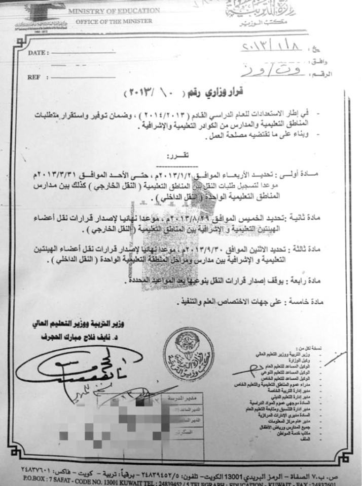 يسعى وزير التربية وزير التعليم العالي د. نايف الحجرف إلى توفير أجواء الاستقرار الوظيفي في الميدان التربوي، إذ منع إصدار أي قرارات نقل للهيئات التعليمية بعد انتهاء الفترة المحددة لذلك.
