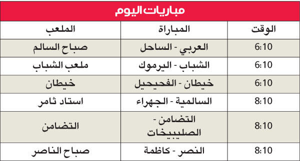 العربي والساحلفي المواجهة الأولى بين العربي والساحل يسعى الأخضر، الذي يفتقد اليوم جهود طلال نايف وعبدالعزيز السليمي وفهد الحشاش للإصابة، وعبدالله الشمالي وعبدالقادر فال للإيقاف، إلى استعادة توازنه بعد أن تضاءلت فرصته في المنافسة على لقب الدوري الممتاز إثر خسارته الفادحة على يد الكويت بثلاثية، في حين يعاني الساحل من مرحلة انعدام وزن، حيث يحتل المركز الأخير في دوري الدرجة الأولى، وتعرض لخسارة كبيرة في آخر مباراة له على يد الفحيحيل قوامها أربعة أهداف مقابل هدف.الشباب واليرموكأما المواجهة الثانية بين الشباب واليرموك فتخرج عن نطاق التوقعات نظراً لأن الفريقين يلعبان في دوري الدرجة الأولى بغض النظر عن موقعهما في جدول الترتيب، حيث يحتل الشباب مركز الوصافة وله 27 نقطة، في حين يحتل اليرموك المركز الخامس وله 11 نقطة، وذلك نظراً لرغبتهما الجامحة في التأهل لدور الثمانية.خيطان والفحيحيل وما ينطبق على المباراة السابقة ينطبق على المباراة الثالثة بين خيطان والفحيجيل، حيث يسعى الجهاز الفني للفحيحيل إلى استثمار تربع الفريق على قمة الأولى من خلال استغلال الروح المعنوية المرتفعة للاعبين، أما الجهاز الفني لخيطان فيرى أن تحقيق نتيجة ايجابية على أرضه ووسط جماهيره اليوم ستسهل إلى حد بعيد عليه لقاء الإياب.السالمية والجهراءومن جهته، فإن السالمية لن يرضى في اللقاء الرابع الذي سيجمعه مع الجهراء عن الفوز بديلاً للتأكيد على أن الفريق يسير بخطى ثابتة نحو تحقيق العديد من الانتصارات رغم خسارته في الجولة الـ15 من الدوري الممتاز أمام القادسية، ومن المحتمل أن يجري مدرب السماوي عبدالعزيز حمادة بعض التغييرات على التشكيلة الأساسية، أما الجهراء فعاد مجدداً إلى طريق الانتصار بفوز في الجولة ذاتها على النصر، وهو ما يعني أن الروح المعنوية للاعبين مرتفعة جدا.التضامن والصليبيخات«الجريحان» هو الوصف الذي يطلق على طرفي المواجهة الخامسة بين التضامن والصليبيخات، حيث تقهقر الأول من قمة دوري الدرجة الأولى إلى المركز الثالث، في حين واصل الصليبيخات الذي يفتقد اليوم لجهود ناصر الهاجر ووالسي للإيقاف سلسلة هزائمه في «الممتاز»، لذلك ستكون الفرصة سانحة أمامهما لتحقيق فوز يرضي طموح عشاقهما.النصر وكاظمةأما المواجهة السادسة والأخيرة بين النصر وكاظمة فهي واحدة من أقوى المواجهات في هذا الدور نظراً لتقارب مستوى الفريقين، لكن مع اختلاف ظروفهما، حيث تعرض النصر للهزيمة على يد الجهراء في الـ«الممتاز» وهي الهزيمة التي دفعت به بقوة إلى منطقة الخطر مجدداً، بينما فاز كاظمة الذي يغيب عنه اليوم حمد الحربي وعبدالله الظفيري للإيقاف على الصليبيخات وهو الفوز الذي جعله ينفرد بالمركز الرابع.