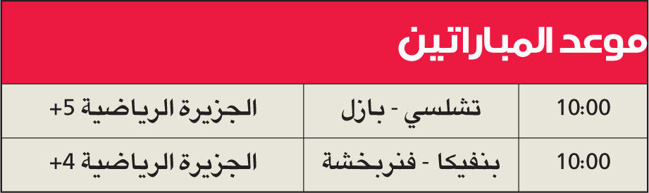 يسعى تشلسي الإنكليزي إلى إنقاذ موسمه عندما يواجه بازل السويسري اليوم، في نصف نهائي الدوري الأوروبي لكرة القدم، والذي يشهد في الطرف الآخر مواجهة بنفيكا البرتغالي مع ضيفه فنربخشة التركي.