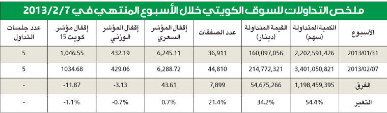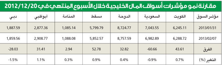 أبوظبي... أداء متوازنتميز مؤشر سوق ابوظبي بادائه المتوازن الافضل والذي كان حاضرا طوال فترة العام الماضي، بعكس اداء معظم الاسواق الخليجية واستطاع ان يكمل مكاسب الشهر الماضي ليتجاوز 10 في المئة خلال هذا العام بعد ان ربح خلال الاسبوع الاول من فبراير 1.1 في المئة وتعادل 31.41 نقطة مخترقا مستوى 2900 نقطة ومقفلا عند النقطة 2908.77 نقاط.مسقط... عودة إلى النموبعد تذبذب خلال الشهر الاول من هذا العام استطاع مؤشر مسقط ان يقفل عند مستوى 5852.57 نقطة مع نهاية تعاملات الاسبوع الماضي، بعد ان ربح 9 اعشار النقطة المئوية وتعادل 52.78 نقطة مدعوما بنمو ارباح شركات الاستثمار العمانية التي بلغت 20 في المئة تقريبا، كما كان لأثر فتح آفاق تعاون عماني اميركي اثرا ايجابا طغى على معظم جلسات الاسبوع الخمس.الكويتي... صعود رغم الضغطشهدت آخر جلستين في سوق الكويت للأوراق المالية ضغطا كبيرا جراء عمليات بيع واسعة شملت معظم الاسهم الصغرى التي كانت المحرك الاكبر لمكاسب واسعة على مستوى المؤشر السعري الذي انهى الاسبوع محققا ارتفاعا بنسبة 0.7 في المئة اي 43.61 نقطة ليقفل عند مستوى 6288.72 نقطة بعد ان اخترق مستوى 6300 نقطة في اكثر من جلسة غير انه لم يستطع التمسك به. وكانت خسائر المؤشرات الوزنية مماثلا لمكاسب السعري او اكثر وخسر الوزني 0.7 في المئة اي 3.13 نقاط ليقفل عند مستوى 429 نقطة، وزادت في مؤشر كويت 15 حيث تجاوزت نقطة مئوية بقليل وتعادل 11.87 نقطة ليقفل عند مستوى 1034.86 نقطة.وزاد النشاط قياسا بالاسبوع الاخير في شهر يناير بمقدار النصف وارتفعت السيولة بنسبة الثلث وذلك بعد مساهمة اموال ساخنة دخلت على اسهم منتقاة هي الاصغر سعريا في السوق لتتصدر مؤشرات القيمة والسيولة معظم جلسات الاسبوع ورغم الاجواء السلبية التى سادت بيئة السوق خلال آخر جلستين بسبب تغيرات المشهد السياسي بعد حكم بالسجن ثلاث سنوات لأعضاء مجلس امة سابقين.الدوحة والمنامة... مكاسب محدودةبلغت مكاسب الدوحة 0.4 في المئة خلال الاسبوع المنصرم ليتجاوز المؤشر مستوى 8750 نقطة رابحا 32.78 نقطة، وكان دعم نتائج شركات قيادية واضحا بعد تراجع مؤشرات اسواق عالمية ليستقر مؤشر سوق الدوحة عند مستوى 8757.59 نقطة.واستمر اداء سوق المنامة الايجابي بعد سلسلة تراجعات طويلة حققها خلال العام الماضي ليغير اتجاهه وتزداد سيولته بشكل واضح وبدعم من اسهم مصارف اهمها بنك البحرين السلام وبعض اسهم قطاع الصناعة، ليصل سوق المنامة الى مستوى 1088.08 نقطة رابحا حوالي 3 نقاط تعادل نسبة ثلث نقطة مئوية هي الاقل بين مكاسب بقية الاسواق الخليجية.خسائر دبي والسعوديةلا شك ان خسائر مؤشر سوق دبي منطقية جدا خلال الاسبوع الماضي بعد مكاسب كبيرة جدا تجاوزت 16 في المئة خلال يناير الماضي، وتراجع تحت عمليات جني الارباح ليقفل على خسارة تعتبر محدودة مقارنة بمكاسبه البالغة 1.5 في المئة وتعادل 28 نقطة ليتراجع الى مستوى 1859.56 نقطة.وكانت مكاسب مؤشر تاسي السعودي مرتبطة بأداء الاسواق العالمية خصوصا الاوروبي منها والذي واجه تراجعات حادة منتصف الاسبوع تجاوزت في بعضها نسبة 4 في المئة اثرت على اداء معظم الاسواق العالمية الاخرى، ليتراجع المؤشر السعودي زائرا مستوى 6900 نقطة ومقفلا هناك عند مستوى 6982.89 نقطة، كما كان لبعض الاخبار على مستوى شركات سعودية تأثيرا مضاعفا لينهي اسبوعه على خسائر قدرها 60.66 نقطة اي نسبة 0.9 في المئة.