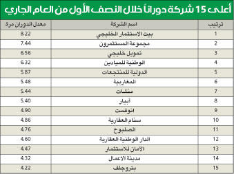 يعد معدل الدوران مقياساً للسيولة والجاذبية الشرائية التي يتمتع بها السهم، ويتم حسابه بقسمة عدد الأسهم المتداولة من بداية السنة على عدد أيام التداول ومقارناتها بعدد الأسهم المصدرة للشركة، وبذلك يوضح عدد مرات دوران إجمالي أسهم الشركة خلال هذه الفترة.
