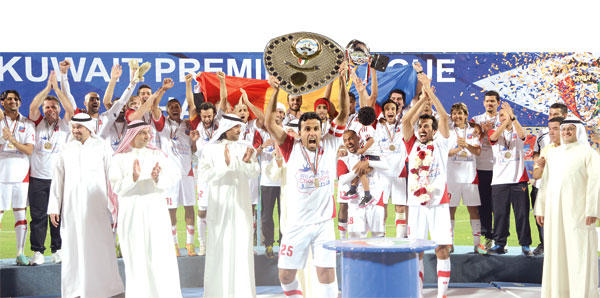 احتفل لاعبو الكويت بلقب بطولة الدوري الممتاز لكرة القدم الـ 11 في تاريخ النادي، عقب انتهاء مباراتهم أمام القادسية مساء أمس على استاد الكويت، حيث توجوا رسمياً باللقب.