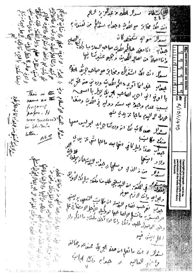 سؤال: أنت لك مخابرة مع الكويت؟ جواب: سؤالكم من تعنون به؟ سؤال: مع اي شخص كان. جواب: انا معتمد حاكم الكويت صاحب السعادة مبارك باشا الصباح، وأنا أصلا من أهالي الكويت وجميع عشيرتنا فيها. سؤال: أنت لك اشتراك ومخابرة مع صاحب جريدة "الخلافة"؟ جواب: خير انما آمري حاكم الكويت وردني منه تحرير يأمرني أني أحرر لصاحب الجريدة يرسل باسمه بسبب عدم وجود بوستة دولية في الكويت، ومنذ ان حررت الى اليوم ما جا (جاء) عن يدي شي. سؤال: هو كاتب لك انه وردتنا جرايد بحر ليس معها منك مكاتيب. جواب: هذا دليل كافي إنها بعد ما اجا شي عن يدي ولا رأيتها. سؤال: من ذا الذي مرسلها؟ جواب: البوستة خانة يرسلون على طريق البحر. سؤال: يقول في المكتوب انه البوستجي طلب منا مكتوب وسلم لك الأوراق والجرايد وأنت لازم معرفة. جواب: نعم حسب نضام (نظام) البوستة ان مكاتيب التعهد يعني الرجسترية ما تتسلم الا لصاحبها او وكيله لأجل الإمضاء في علم وخبر الوصول طلبه ذلك وانا آخذ مكتوب ما أفكه ولا اعلم ايش فيه. سؤال: انت ما تعلم ان هذه الجريدة ممنوعة ومخالفة مراضي العالية؟ جواب: خبر لا اعلم ذلك وهذا شي من وضايف الحكومة، اذا هيا (هي) ممنوعة ومخالفة لمراضي العالية أنا لا اقبل ذلك، ونحن من الآباء والأجداد خدام الدولة العلية ونطلب مراضيها ولا خرجنا عن طاعتها ولا نخرج الآن. اذا الحكومة تأمر نكتب تلغراف الى الجريدة لا تجي (لا ترسل) بواسطتي. سؤال: عبدالله العتيقي منه؟ جواب: كاتب حاكم الكويت. سؤال : جمعية الإسلام وين؟ جواب: لا اعرف محلهم ولا شايف جريدتهم، هم كتبوا رأسا لحاكم الكويت، ولا رغب في مطالعة جريدتهم وكتب لهم رافض الاشتراك، ولا يعرف محلهم. عرفني اسأل عن محلهم وأرسل المكتوب، طلبت من الظرف لا اعرف محلهم لما حظر الظرف أيضا ما عرفنا منه شي. أرسلنا مكتوب باجره قاطين اي محل يجدونه يتسلم لهم." ولا بد من الإشارة في نهاية مقال اليوم الى ان الشيخ مبارك سعى مرات عديدة من خلال المعتمد البريطاني لإطلاق سراح عبدالعزيز البدر (انظر كتاب "بيان الكويت" ص269-268)، ووصل الموضوع الى سفير بريطانيا في اسطنبول الذي تحدث مع السلطان العثماني أكثر من مرة حول الأمر دون جدوى. وقد عاد البدر الى الكويت بعد إطلاق سراحه عام 1904، وعاش عزيزا مكرما واستمر في خدمة الشيخ مبارك ومن بعده أمراء الكويت من مقر إقامته في البصرة وتوفي عام 1946 وعمره يزيد على الثمانين عاما.