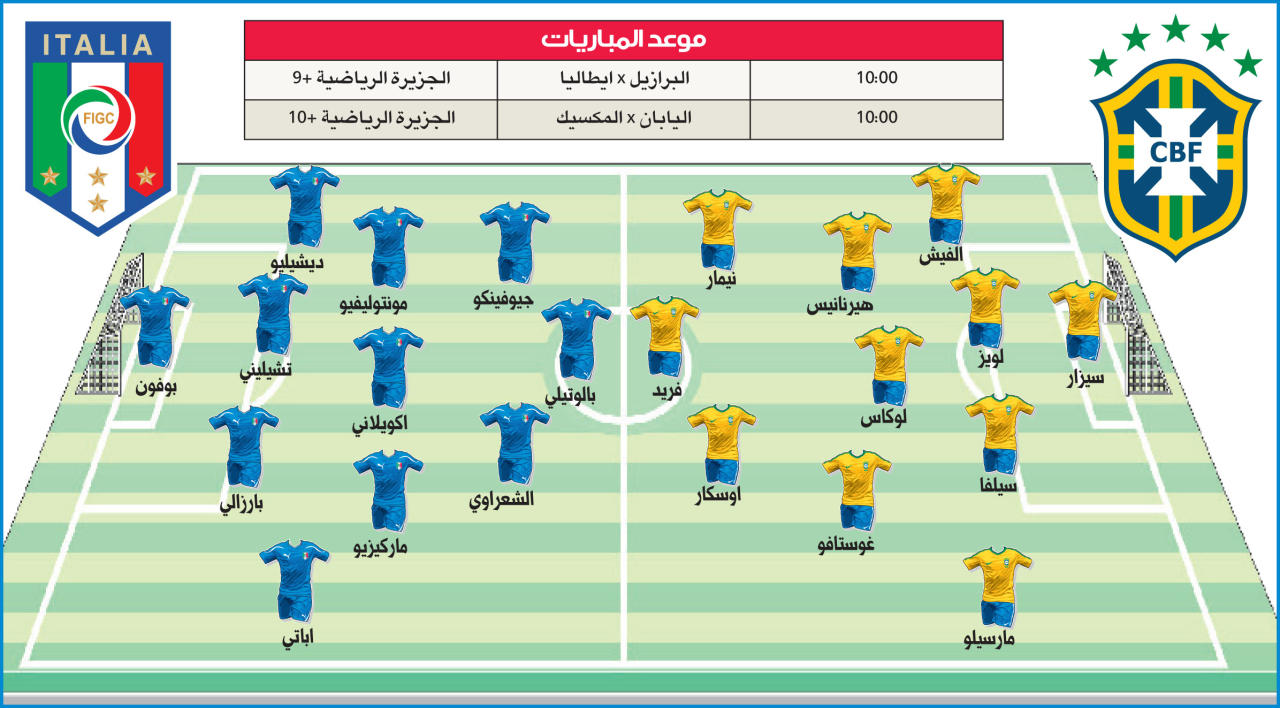 وتتجه اسبانيا الى حسم صدارة المجموعة الثانية بعد ان فازت في الجولة الاولى على الاوروغواي بطلة اميركا الجنوبية 2-1 ثم الخميس على تاهيتي بطلة الكونكاكاف بنتيجة كاسحة 10-صفر.ويبدو المنتخب البرازيلي بقيادة المتألق نيمار، المنتقل من سانتوس الى برشلونة الاسباني مقابل 57 مليون يورو، الاوفر حظا للخروج فائزا من موقعة اليوم استنادا الى العرضين اللذين قدمهما امام اليابان (3-صفر) والمكسيك (2-صفر) والى الصورة التي ظهر بها المنتخب الايطالي امام اليابان حيث عانى بدنيا وفنيا في مجاراة "الساموراي الأزرق" لكنه تمكن بواقعيته المعتادة من الخروج فائزا 4-3 بفضل هدف متأخر لسيباستيان جوفينكو في مباراة تخلف خلالها صفر-2.وسيلعب عامل الارهاق دوره في موقعة السبت التي ستكون اعادة لمباراة المنتخبين في نسخة 2009 حين فازت البرازيل بثلاثية نظيفة ايضا في الدور الاول الذي خرج منه ابطال العالم حينها بعد خسارتهم امام مصر ايضا، وقد تحدث مدرب "الآزوري" تشيزاري برانديلي عن هذه المسألة قائلا: "تركيزنا منصب حاليا على عدد اللاعبين الذين بإمكاننا استعادتهم (تعافيهم من الارهاق). المباراة ضد البرازيل مهمة جدا ولا يجب الاستهانة بها".وسيكون الهم الاساسي لبرانديلي كيفية احتواء نيمار الذي سجل هدفين رائعين في المباراتين الاوليين لبلاده وهو يأمل ان يرفع غلته ضد ايطاليا التي تحدث عن مواجهتها قائلا: "انا سعيد لتسجيلي هدفين لكن المباراة امام ايطاليا ستكون صعبة للغاية. انهم فريق رائع وامل ان اسجل ضدهم. لا تهمني الطريقة التي اسجل بها طالما اني اساعد المنتخب الوطني".وتعيد مباراة السبت الى الاذهان الكثير من المواجهات التاريخية بين العملاقين المتوجين معا بلقب ابطال العالم 9 مرات، ولعل اهمها نهائي مونديالي 1970 و1994 حين خرجت البرازيل فائزة في المناسبتين، الاولى بنتيجة 4-1 بقيادة الأسطورة بيليه والثانية بركلات الترجيح بعد تعادلهما صفر-صفر في الوقتين الاصلي والاضافي. وفي المجمل تواجه الطرفان ست مرات في البطولات الرسمية، بينها 5 في كأس العالم واولها في نصف نهائي 1938 حين فازت ايطاليا 2-1 ثم نهائي مكسيكو 1970 ومباراة المركز الثالث في الارجنتين 1978 حين فازت البرازيل 2-1 والدور الثاني من اسبانيا 1982 حيث فاز ايطاليا 3-2 في طريقها الى اللقب، اضافة الى نهائي الولايات المتحدة 1994 ومواجهة الدور الاول من كأس القارات 2009.وتعود المواجهة الاخيرة بينهما الى 21 مارس الماضي حين تعادلا 2-2 وديا في جنيف في مباراة تخلف خلالها "الازوري" صفر-2. وبشكل عام تواجه المنتخبان 15 مرة في السابق وفازت البرازيل 7 مرات وايطاليا 5 مرات مقابل 3 تعادلات.المكسيك تواجه اليابانوعلى ملعب "استاد غوفرنادور ماغالهاييس" في بيلو هوريزنتي، يلتقي المنتخبان المكسيكي والياباني في نفس التوقيت في مباراة هامشية يسعى خلالها كل من الطرفين الى توديع البطولة بفوز شرفي يحفظ له ماء الوجه.وستكون هذه المباراة اعادة لمواجهتهما في الدور الاول من البطولة ذاتها عام 2005 حين فازت المكسيك 2-1، علما بانها كانت المباراة الرسمية الوحيدة بينهما لكنهما تواجها وديا ثلاث مرات وفازت اليابان بالاولى عام 1996 (3-2) قبل ان تخسر التاليتين (1-2 وصفر-1) عامي 1998 و2000.