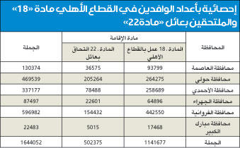 البطاقة القديمةوذكر العسعوسي انه سيتم إصدار البطاقات المدنية الذكية للوافدين على مراحل عند تجديد الإقامة، وفقا للمحافظات، حيث ستكون المرحلة الأولى لمحافظتي العاصمة ومبارك الكبير، إذ سيتم إيقاف إصدار البطاقة القديمة للأشخاص حاملي الإقامة من المادتين 18 و22 ممن يقطنون في هاتين المحافظتين، حتى يتم توفير المستندات اللازمة لإصدار البطاقة الذكية، وهي صورة حديثة مطابقة للمواصفات المطلوبة، وفصيلة الدم، وصورة عن جواز السفر، على أن تتوافر هذه المستندات.وزاد انه لن يتم إصدار البطاقات المدنية لهذه الشريحة، من خلال نظام الاستعلام الصوتي او من خلال الانترنت، كما كان معمول به في السابق الا بعد توفير المستندات المطلوبة، مبينا أنه بالنسبة للقاطنين في المحافظات الأخرى، والراغبين في الحصول على البطاقة الذكية، فإن الهيئة على استعداد لاستقبال معاملاتهم اذا كانت مستوفية المستندات بغض النظر عن مكان السكن.وعن ضرورة مراجعة الهيئة، قال العسعوسي إنه يمكن تقديم المستندات المطلوبة من خلال أجهزة المغلف الموجودة في الجمعيات التعاونية، او من خلال مراجعة المقر الرئيسي او فروع الهيئة في جمعيات سلوى والجهراء وكيفان، كما يمكن تسليم المعاملات من خلال فروع الهيئة الكائنة في مكاتب الهجرة بالمحافظات.ولفت الى ان المرحلة المقبلة ستبدأ بمحافظة الجهراء ثم الاحمدي ثم حولي فالفروانية، وسيتم إعلان هذه المراحل تباعا، داعيا الجمهور الى التعاون مع الهيئة في إنجاز أهدافها من هذا المشروع، الذي يشكل لبنة أساسية في البنية التحتية لخدمات الحكومة وتسهيل الإجراءات.خطة استراتيجية وتابع العسعوسي ان الوقت حان لادخال شريحة الوافدين من العاملين في القطاع الاهلي من اصحاب مادة 18، وفئة الالتحاق بعائل مادة 22 في مشروع البطاقة الذكية، نظرا لارتباط تطبيقات البطاقة الذكية بشريحة الوافدين على مستوى الخطة الاستراتيجية للدولة.وشدد على اهمية هذه الشريحة كونها الشريحة الاكبر في مكونات التركيبة السكانية للدولة، بتعداد يتجاوز مليونا و645 الف نسمة، مشيرا الى تحركات سريعة على مستوى الاستفادة من تطبيقات البطاقة الذكية في ما يتعلق بالقطاع الصحي والتعليمي والمصرفي والنفطي.وأشار الى ان موضوع التنقل بين دول الخليج مازال مقتصرا على الخليجيين فقط، على ان يكون للوافدين مستقبلا، بناء على قرارات مجلس التعاون، علما ان البنية التحتية لادخال الوافدين بهذا المشروع جاهزة.واكد ان دور الهيئة يقتصر على انشاء البنية التحتية بالنسبة لتطبيقات البطاقة الذكية، مثل الملف الصحي والتعليمي، مبينا ان ارتباط هذه التطبيقات يتم بالتنسيق مع دول المجلس، مبينا ان الهيئة بانتظار ان تقدم وزارة الصحة البيانات اللازمة لوضعها في البطاقة، مشيرا الى ان تجميع هذه البيانات يتطلب ربطها بالمستشفيات والمراكز الصحية.واوضح ان الهيئة تنتظر مبادرة الوزارات والجهات المعنية للاستفادة من تطبيقات البطاقة الذكية، لاسيما بعد انجاز الهيئة بنيتها التحتية، مثنيا على مبادرة وزارتي الصحة والتربية، لافتا الى التنسيق مع وزارة التربية للاستفادة من تطبيقات البطاقة الذكية في بعض المدارس.لا غرامات للمواطنين غير المجددينأكد العسعوسي انه لا يوجد أي غرامات مالية بحق غير المجددين للبطاقة المدنية للمواطنين، فالهيئة ليست بحاجة لتطبيق غرامات، مبينا ان الفرد هو الذي يحتاج تجديد هذه البطاقة لاجراء معاملاته، لافتا الى ان نسبة المواطنين الذين جددوا البطاقة المدنية حتى الآن 95 في المئة، أما النسبة الباقية فقد يكونون خارج الكويت بغرض الدراسة او العلاج.واردف: «أما بالنسبة للوافدين فليس هناك غرامة في حال عدم تجديد البطاقة المدنية، وتنطبق المخالفة فقط على عدم تجديد الإقامة».