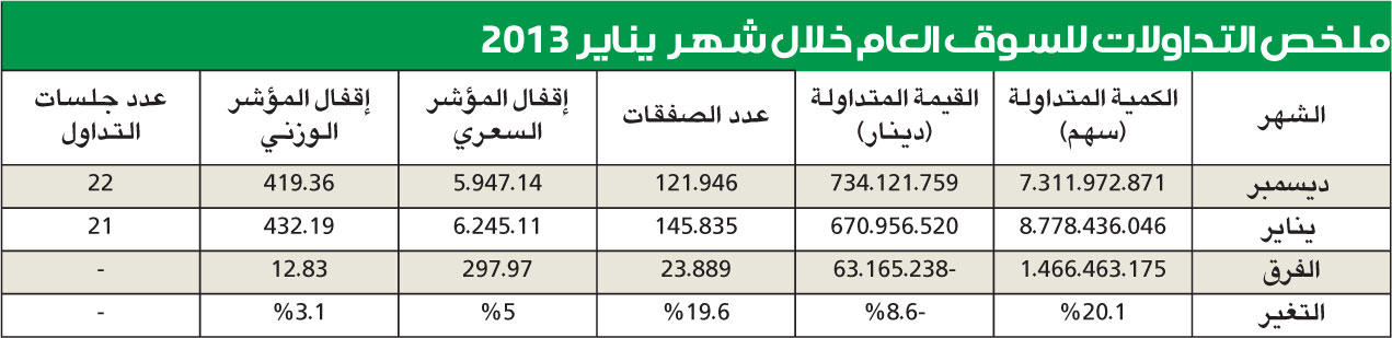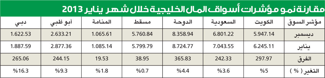 قفزت مؤشرات اسواق المال الخليجية خلال شهر يناير محققة ارتفاعات كبيرة على معظمها، قاربت في دبي مكاسب عام 2012 كاملا والذي سجل خلاله افضل الارتفاعات خليجيا بحوالي 19 في المئة واقفل على ارتفاع خلال الشهر الاول من هذا العام مرتفعا 16.3 في المئة قائدا بقية الاسواق التي جاءت مكاسبها متدرجة، حيث ربح ابوظبي 9.3 في المئة ثم الكويتي 5 في المئة وقطر 4.4 في المئة، وربح السعودي 3.6 في المئة ولم تتعد مكاسب سوق المنامة 2 في المئة واستقر مؤشر سوق مسقط على ارتفاع هو الادنى خليجيا وبنسبة 0.7 في المئة فقط.دبي يواصل التألقواصل مؤشر سوق دبي تألقه كأفضل الاسواق الخليجية أداء العام الماضي وزاد عن ذلك بتسجيل مكاسب كبيرة خلال شهر يناير المنصرم والتي بلغت 16.3 في المئة كأكبر مكاسب له خلال شهر واحد منذ مدة طويلة قد تمتد الى ما قبل الازمة المالية العالمية مسجلا قمما جديدة لم يبلغها منذ سنوات حيث اقفل عند مستوى 1887.59 نقطة بعد أن ربح 265.06 نقطة، وارتفعت قيم وكميات التداول بأكثر من 200 في المئة بقيادة سهم بيت التمويل الخليجي بينما كانت المكاسب لصالح بنك السلام البحرين والذي حقق ارتفاعا بنسبة 67 في المئة.وكان قطاعا العقارات والخدمات من اكثر القطاعات دعما لمؤشر السوق حيث حققا 34 و27 في المئة ارتفاعا على التوالى، وكان اقتصاد الامارة يتجه الى نمو كبير بعد أن نجح في معالجة ازمة ديون شركاته القيادية التي المت به ابان الازمة المالية العالمية، وتقدمت مؤشراته الاقتصادية بشكل ملحوظ حيث تقدم مطار دبي الى اكثر ثالث مطار في العالم استقبالا للركاب وتعافى قطاع العقار بدعم من انتعاش السياحة التي تعتمد عليها الامارة كأحد اهم قطاعاتها الانتاجية.أبوظبي وحذا مؤشر سوق ابوظبي حذو دبي ولكن بمكاسب اقل والتي كانت 9.3 في المئة اي 244.15 نقطة ليقفل عند مستوى 2877.36 نقطة، وكانت اسعار النفط الداعم الاول لمعظم مؤشرات الاسواق الخليجية وأبوظبي أحدها وسار اقتصاد الامارة الاغنى في الامارات العربية المتحدة بخطى ثابتة وكان مؤشر سوقه المالي كذلك حيث انه الاقل تذبذبا بين الاسواق الخليجية.وقد شهد السوق الظبياني الموافقة على اندماج شركتي الدار وصروح التي دعمت مؤشرات القطاع العقاري ليكسب 26 في المئة خلال الشهر ويسجل اكبر ارتفاع بين القطاعات وذلك بعد ان كسب صروح 40 في المئة متساويا مع الهلال الاخضر الذي ربح ذات النسبة، وارتفعت قيم وكميات التداول بنسب زادت على 150 في المئة بعد ان شهدت تدفقا بالسيولة اعطى للمؤشرات ثباتا لتحقق 15 جلسة خضراء وتراجعها خلال 5 جلسات خلال الشهر.مليار دينار مكاسب الكويتيسجلت مؤشرات سوق الكويت للأوراق المالية مكاسب جيدة بنهاية تعاملات شهر يناير وحققت القيمة السوقية ارتفاعا ملموسا بحوالي 3.5 في المئة حيث بلغت حوالي 30 مليار دينار، وكان النمو مدعوما بنمو عريض لأسعار معظم الاسهم سواء قيادية او صغيرة والتي كانت لها حظوة اكبر حيث ربح السعري 5 في المئة بعد ان اضاف 297.97 نقطة ليقفل عند مستوى 6245.11 نقطة، وربح الوزني كذلك 3.1 في المئة ليقفل عند مستوى 432 نقطة رابحا 12.8 نقطة، وسجل كويت 15 مكاسب بنسبة 3.7 في المئة ليقفل عند مستوى 1046.5 نقطة مرتفعا 37.5 نقطة.وتباين اداء حركة التداولات خلال الشهر المنصرم وارتفع النشاط بنسبة 20 في المئة مقارنة مع الشهر الاسبق بينما تراجعت السيولة بنسبة 8 في المئة بعد تركز التداولات على الاسهم الصغرى وتذبذب سيولة الاسهم القيادية بعد بداية متواضعة لإعلانات نتائجها السنوية حيث جاءت مقاربة للتقديرات والتي كانت تشير الى نمو محدود جدا.قطر والسعوديةسجل مؤشر سوقي قطر والسعودية مكاسب متقاربة بلغت للأول 365.8 نقطة اي ما يعادل 4.4 في المئة ليبلغ مستوى 8724.77 نقطة بينما حقق السوق السعودي ارتفاعا بنسبة 3.6 في المئة اي 242.2 نقطة ليقفل عند مستوى 7043.55 نقطة وكانت مكاسبهما مقاربة كذلك لمكاسب مؤشرات الاسواق عالميا خصوصا داو جونز الذي اقترب كثيرا من حاجز 14 الف نقطة رابحا 5.8 في المئة خلال يناير ليدعم اسعار النفط عالميا وهو عامل مؤثر في اداء شركات قياد