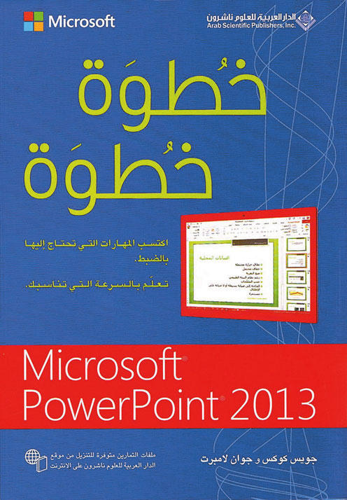 • تدعيم حججك وأفكارك بإضافة صور وأشكال ونصوص عرض فاخر.• التعبير عن البيانات الرقمية بطرق سهلة الفهم بواسطة جدول أو مخططات جذابة بصريًا.• إنشاء أثواب وتصاميم وتخطيطات مخصصة كي يكون لعرضك التقديمي مظهر وطريقة تصرف فريدين.• التعاون مع الزملاء، تدوين ومراجعة الملاحظات لضمان أفضل تقديم ممكن.. واستعمالات أخرى.بنية ثلاثية الأجزاءلمزيد من الفائدة وحتى تتعلم المهارات بالسرعة التي تناسبك، قسم مؤلف كتاب {خطوة خطوة} العمل إلى ثلاث مراحل، توزعت على ثلاثة أجزاء: يستكشف الجزء الأول الخبرة اليومية في باوربوينت 2013. ويناقش الجزء الثاني وسائل تحسين محتوى العرض التقديمي. ويغطي الجزء الثالث تقنيات باوربوينت المتقدمة أكثر، بالإضافة إلى تخصيص وظائفية البرنامج لتلائم الطريقة التي تعمل بها. هذه البنية الثلاثية الأجزاء تتيح للقراء الجدد أن يكتسبوا المهارات الأساسية ثم يبنوا عليها، بينما يستطيع القراء المعتادون على أساسيات باوربوينت 2013 أن يركزوا على المواد التي يحتاج إليها كلٌّ منهم.استكشاف مايكروسوفتتتعلّم في الجزء الأول عما تحتوي عليه برامج باوربوينت المختلفة كي تتمكن من معرفة البرنامج الذي تستعمله. ثم تلقي نظرة عامة على الميزات الجديدة في الإصدارات الحديثة لباوربوينت لمساعدتك في التعرّف إلى التغييرات إذا كنت ترقّي في إصدار سابق. ستستكشف واجهة البرنامج، وتفتح وتتنقّل وتعاين وتُغلق العروض التقديمية بطرق مختلفة. أخيرًا، تستكشف كيفية الحصول على مساعدة من البرنامج.باوربوينت 2013 جزء من مايكروسوفت أوفيس 2013، الذي يتضمن تشكيلة كبيرة من البرامج، من بينها مايكروسوفت أكسس 2013، إكسل 2013، ووورد 2013. يتوافر أوفيس بطبعات مختلفة تتضمن تركيبات مختلفة من البرامج؛ ويمكنك أيضًا شراء معظم البرامج فرديًا. البرامج في طقم أوفيس مصمّمة لتعمل سوية لتزويد طرق فاعلة جدًا لإنجاز الأمور، ويمكنك تثبيت برنامج واحد أو أكثر من برنامج أوفيس في كمبيوترك. لبعض البرامج عدة إصدارات مصمّمة للمنصات المختلفة. رغم أن الهدف الجوهري لكل برنامج يبقى نفسه بغض النظر عن المنصة التي يشتغل عليها، إلا أن الوظائفية المتوفرة والطريقة التي تتفاعل بها مع البرنامج قد تكون مختلفة. ستزوّد وصفًًا موجزًا لمختلف برامج باوربوينت 2013 هنا كي تتمكن من اكتشاف أي فروق بين ما يظهر على شاشتك وبين ما هو مشروح في الكتاب.تحسينات العرضستريد في أغلب الأحيان تدعيم الحجج التي تناقشها في عرض مايكروسوفت باوروبينت 2013 التقديمي بحقائق وأرقام من الأفضل عرضها في جدول. فالجداول تكثّف المعلومات في تنسيقات صفوف وأعمدة بنيوية جدًا كي يسهل التعرّف إلى الفئات أو البنود الفردية وإجراء مقارنات بينها. يمكنك وضع جدول على أي شريحة لباوربوينت، سواء كانت تتضمن نائب محتوى أو لا.إذا كانت المعلومات الجدولية موجودة سابقاً- مثلاً، كورقة عمل لمايكروسوفت إكسل- يمكنك نسخها ولصقها في جدول باوربوينت. إذا كنت تريد الحفاظ على الصيغ، من الأفضل تضمين ورقة العمل ككائن في شريحة باوربوينت.في هذا السياق، ستُدرج وتنسّق جدولاً في شريحةٍ لباوربوينت ثم تُدرج وتعدّل ورقة عمل لإكسل.يتم تطوير الكثير من العروض التقديمية بالتعاون ضمن فريق من الأشخاص. قد تكون قائد فريق تطوير بعض العروض التقديمية التي يراجعها زملاؤك ومدراؤك، وقد تكون مُراجِعًا لعروض تقديمة أخرى طوَّرها زملاؤك. مع مايكروسوفت باوربوينت 2013، يمكنك بسهولة إرفاق عرض تقديمي برسالة بريد إلكتروني وإرساله إلى شخص ليراجعه. إذا كنت تريد إرساله إلى شخص لا يملك باوربوينت 2013، في كمبيوتره، يمكنك حفظه في تنسيق ملف مختلف. وإذا كنت تريد ضمان أن فقط الأشخاص المرخّصين يستطيعون مراجعة عروضك التقديمية، يمكنك تعيين كلمة مرور له.هذه الأيام، تتم مراجعة معظم العروض التقديمية على الشاشة. مع باوربوينت، من السهل إدراج تعليقات، طرح أسئلة، والرد على تعليقات الآخرين. إذا أرسلت عرضًا تقديميًا للمراجعة ثم تلقيته بعد إجراء تغييرات عليه، يمكن
