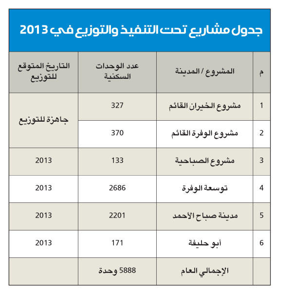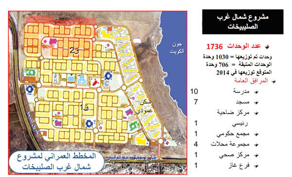 ملايين تصرفها الكويت سنوياً على الخطة الإسكانية لمحاربة كابوس الطلبات الذي بات يلاحق السلطة التنفيذية منذ سنوات ليتفاقم يوماً بعد يوم كاسراً حاجز 100 ألف طلب إسكاني بعيداً عن تنفيذ واقعي ومرضٍ يلبي حاجة المواطن إلى المسكن الذي كفله الدستور الكويتي.«الجريدة» تسلط الضوء على سير أموال الخطة الإسكانية التي أنفقتها الدولة في الخطة السنوية المعتمدة للسنة المالية 2012/2013 والتي تضمنت صرف مبالغ طائلة، جاء جزء كبير منها لإصلاح ما تم العمل به بالسابق ولصيانة جزء آخر وإكمال المستجد من الأعمال وما سيتم العمل به لاحقاً.المشاريع المرتقبة ستؤدي إلى تلبية القسم الأكبر من الطلبات المقدمةتشكل المشاريع السكنية في الخيران والوفرة وشمال غرب الصليبخات ومدينتي جابر الأحمد وصباح الأحمد، وأبو حليفة عصب الخطة الإسكانية التي تراهن الجهات المعنية على تلبيتها للحاجة السكنية الملحة، وقد قطع العمل ببعض هذه المشاريع خطوات متفاوتة بين مشروع وآخر، مع تأكيد الجهات التنفيذية على ان الإنجاز سيكون في المواعيد المحددة، وان المشاريع المرتقبة ستؤدي الى تلبية القسم الأكبر من الطلبات المقدمة.مدينة الخيرانوفي إضاءة على خريطة المشاريع ومراحلها التنفيذية يتضح ان مدينة الخيران تشكل واحدة من ثلاثة مشاريع اساسية (بالإضافة الى المطلاع والصبية) تراهن عليها الحكومة اليوم لتوفير 175 ألف وحدة سكنية، وتقدر التكلفة الاجمالية للمشروع بأكثر من 4 مليارات دينار بالتعاون مع القطاع الخاص وذلك من خلال تأسيس عدد شركة واحدة مساهمة عامة كويتية لتنفيذ المشروع.ويحتوي مشروع مدينة الخيران على 35130 وحدة سكنية والمتوقع بدء توزيعها من عام 2016 وحتى 2020 وتأتي مراحل وخطوات تنفيذه فور الانتهاء من تأسيس الشركة وتوقيع عقد الـB.O.T للمشروع.الوفرة السكنيةوخصصت المؤسسة العامة للرعاية السكنية 51.749.000 مليون دينار لمشروع توسعة منطقة الوفرة السكنية وبناء 2904 وحدات سكنية جديدة وقد انتهت عمليات التصميم على ان يبدأ التنفيذ في مراحل قريبة.سعد العبداللهوعلى الرغم من توزيع السكنية مدينة سعد العبدالله منذ نهاية 2011 وحتى الربع الأول من 2012 إلا انها خصصت 4 مشاريع جديدة لها، اولها المرافق العامة للمدينة لاستكمال مشروعات المرافق العامة فيها والتي تأتي بميزانية ضخمة تبلغ 42 مليون دينار صرف منها 1.534.000 مليون دينار في السنة المالية 2012/2013 والتي تركزت بالانتهاء من نسبة 43 في المئة من أعمال تنفيذ مدرسة ثانوية بالقطعة 8 والانتهاء من نسبة 9 في المئة من اعمال تنفيذ مركز الشباب.اما المشروع الثاني فهو لأعمال الإنارة في قطعة 11 وتمديد الكيبلات بتكلفة اجمالية للمشروع 754.238 ألف دينار دفع منها 364 الفاً في السنة المالية ذاتها.ويأتي المشروع الثالث لأعمال الطبقة السطحية بالتعاون مع القطاع الخاص لاستكمال مشروعات البنية الاساسية للمدينة والتي جاءت بتكلفة اجمالية كبيرة تقدر 6.781.000 ملايين دينار صرف منها 834 الفا لنفس السنة المالية.شمال غرب الصليبيخاتويعاني مشروع شمال غرب الصليبيخات من مشاكل في التربة التي تحتاج لمعالجتها وتحسين خواصها الضعيفة لكامل مساحة المشروع متمثلا في 1736 وحدة سكنية موزعة في 1030 قسيمة و396 بيتا و310 شقق.وتبلغ التكلفة الاجمالية لقسائم شمال غرب الصليبخات 14.750.000 مليون دينار اما البيوت فتبلغ تكلفتها بقيمة 23.760.000 مليون دينار الى جانب صرف 21.700.000 مليون دينار لتنفيذ 310 شقق منها 6.652.000 ملايين دينار للسنة 2012/2013. وخصصت المؤسسة العامة للرعاية السكنية 31.145.000 مليون دينار للمرافق العامة للمشروع وذلك للانتهاء من تنفيذ 7 مساجد و10 مدارس و4 مجموعة محلات وفرع واحد للغاز مع سوق مركزي رئيسي ومخفر للشرطة ومركز صحي الى جانب مجمع حكومي و52 محطة محولات كهرباء في المنطقة.مدينة جابر الأحمدورغم بعض مشاكل التربة تسير الأعمال التنفيذية بخطى حثيثة في مشروع مدينة جابر الاحمد الذي يتكون من 6679 وحدة سكنية، يشمل عدد 4494 قسيمة بتكلفة اجمالية 41.896.415 مليون دينار وذلك للانتهاء من نسبة 100 في المئة م