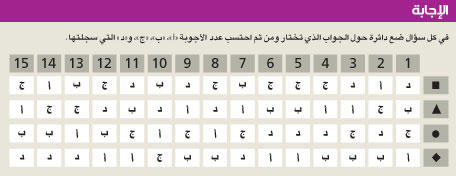 ▲ تعتبر أن الصدف تكون أحياناً جيدة.• لا تتفاجأ كثيراً، فساعتك لم تحن بعد.◆ تفكّر في مَن لم يحالفهم الحظ ولقوا حتفهم.-2 ما يثير حقّاً استياءك؟■ ألا تنعم بدقائق من الوحدة.▲ أن تعيش بعيداً عن الطبيعة.• ألا تتمكن من تقديم المساعدة لمن يطلبونها منك.◆ أن تُحرم من القدرة على القراءة والتفكير.-3 أي من هذه التحديات يتطلب الجهد الأكبر؟■ إدارة فريق بيد من حديد.▲ السهر خارج المنزل كل ليلة.• العمل في مكتب في الطابق الخمسين من أحد الأبراج.◆ تقديم برنامج عن الظواهر الخارقة.-4 ينتقد زملاؤك بشدة سلوكك ضمن الفريق. فما يكون رد فعلك؟■ تنظّم اجتماعاً. ويشمل البرنامج عرض المشاكل كافة وطرح الحلول لتحسين الأداء الجماعي.▲ تقوم بفحص ذاتي، مراجعاً كل انتقاد.• تطلع المسؤول عنك في العمل على ما يجري، طالباً منه الدعم والمساعدة.◆ تطلب من كل منهم على حدة توضيح الأسباب التي تجعلهم يظنون ذلك.-5 يتأثر أولادك بتقرير عُرض على التلفزيون ويسألونك: لمَ لا يزال الأطفال يموتون جوعاً في عالمنا؟■ تخبرهم أن الوضع لن يتبدّل ما دامت الأنانية تحكم العالم.▲ تقدم لهم عرضاً جغرافيّاً وسياسيّاً يناسب سنهم.• تقترح عليهم أن يتبرعوا بجزء من مصروفهم لجمعية خيرية.◆ تقترح عليهم التفكير في هؤلاء الأطفال قبل كل وجبة.-6 ماذا يقول لك الصوت في داخلك عندما تواجه عائقاً غير متوقع؟■ «لن يوقفك هذا!».▲ «حافظ على هدوئك».• «ساعدني يا رب».◆ «ما الرسالة التي يحملها هذا التحدي؟».-7 أي دور تشعر أنه يُناسبك؟■ مَن يشرح.▲ مَن يصغي.• مَن يأخذ المبادرة.◆ مَن يلطف الأجواء المشحونة.-8 ما سبيلك إلى شحن طاقتك وإعادة تنظيم أفكارك؟■ التنزه في الغابة.▲ الاسترسال في الأحلام في سريرك.• التأمل في مكان ما.◆ القراء في غرفة هادئة.-9 ما هي أولوياتك في الحياة؟■ الأكل- الصلاة- الحب.▲ الصلاة- القراءة- العمل.• السير- الاعتناء بالنفس- التواصل.◆ التأمل- التفكير- التواصل.-10 «أضف القليل من السحر إلى حياتك». كيف تصنّف هذه العبارة؟■ عبارة طفولية.▲ عبارة ملهمة.• عبارة خطيرة.◆ عبارة قوية. -11 إلى أي رسائل تصغي عموماً كي تحقق أهدافك؟■ رسائل الصوت الخفي داخلك.▲ رسائل الأمثال القديمة.• رسائل الطبيعة.◆ رسائل الكتب المقدسة.-12 من بين العبارات التالية، ماذا تختار لتبدأ قصة:■ أقفل كيسه، أشعل النار، وراح ينتظر.▲ تأمل البحيرة للمرة الأخيرة وطار.• راح يخاطب الحشود الغاضبة بصوت ثابت لا يرتجف.◆ أقفل الباب الكبير وابتعد عن رفاقه.-13 اختر الشجرة التي تفضلها:■ الزيتون.▲ البندق.• السرو.◆ السنديان.-14 خلال عشاء مع الأصدقاء يتوتر الجو فجأة. كيف تتصرف؟■ تنغلق على ذاتك كالمحارة.▲ تمازحهم بأداء دور المدرب.• تحاول تغيير موضوع النقاش.◆ تحاول امتصاص غضبهم.-15 ما الطاقة التي تشع منك في رأيك؟■ الحيوية.▲ الهدوء.• الأمان.◆ الكرم.غالبية «أ»، مرشدك الداخلي زاهد:عندما تواجه صعوبات في الحياة يدلك مرشدك على الطريق الذي يبدّي الانطواء على الذات، الإصغاء، والإرادة.نقاط القوة: تتحلى بصبر طويل ولا تخشى بذل الجهد ولا الوحدة. تفضل السكوت والتأمل. تحاول الابتعاد عن التجمعات الكبيرة، وتتفادى الشجار. تتمتع بقدرة كبيرة على النظر إلى المسائل من بعيد، والانفصال عن ذاتك لتحكم عليها بموضوعية.نقاط الضعف: يجعلك التعبير عن المشاعر القوية تفقد توازنك. ومخافة أن تعلق وسط دوامة من العواطف وتدخل لعبة العلاقات التي لا تجيدها، تؤثِر التكتم أو حتى الانسحاب. لكن تصرفك هذا يجعلك أحياناً تشعر بالوحدة، حتى إن البعض قد يسيء فهمك.للحفاظ على توازنك: حاول التقرب من الآخرين. اطلب رأيهم أو مساعدتهم في مسألة ما. فلا يعودون يعتبرونك بارداً وعدائيّاً، فضلاً عن أنك ستكتشف متعة تمضية الوقت معهم.غالبية «ب»، مرشدك الداخلي فيلسوف:يحاول دوماً البحث عن المعنى أو الحقيقة أو اكتشاف أفكار جديدة... يدفعك مرشك الداخلي إلى الوثوق بنفسك وبذكائك للتقدّم وحلّ مشاكلك.نقاط القوة: يجعلك ذكاؤك وفضولك تشكك في المسائل كافة. ويتيح لك شغف