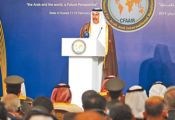 وبين الجاسم ان تطوير العلاقات العربية مع الولايات المتحدة والدول الغربية عموماً يقتضي بالضرورة التوصل إلى حل عادل ودائم وشامل للقضية الفلسطينية، لافتا الى أن العلاقات العربية - الإيرانية علاقات قديمة وثابتة رسخها التاريخ وعمقتها الجغرافيا ولذلك فهي قادرة على الصمود في وجه الأزمات. وفي ما يلي نص الكلمة:سمو الشيخ جابر مبارك الحمد الصباح رئيس مجلس وزراء دولة الكويت الشقيقةأصحاب السمو والمعالي والسعادةالسيدات والسادةالسلام عليكم ورحمة الله وبركاته،،أولاً أشكر الاخ الكريم السيد محمد جاسم الصقر على دعوته لي للمشاركة في هذا المؤتمر المهم والذي أثق بأن مناقشاته ستفتح آفاقاً جديدة على صعيد الرؤى والأفكار تجاه واقع عالمنا العربي ومستقبله ومستقبل علاقاته الإقليمية والدولية، خاصة في ظل هذه التحولات والمتغيرات الكبيرة التي تشهدها المنطقة وتداعياتها وانعكاساتها وتأثيراتها في الداخل العربي وأصدائها في الخارج.وبغض النظر عما يجري حالياً في العالم العربي من ثورات وانتفاضات ومن تغيير لأنظمة الحكم في بعض الدول العربية ومن توجه دول عربية أخرى لإصلاح وتطوير أنظمتها السياسية بحيث تواكب روح العصر وتنسجم مع التطلعات الشعبية وتتيح فرصاً أكبر للمشاركة السياسية، بغض النظر عن كل ذلك فإن عالمنا العربي بحكم موقعه وموارده وتاريخه وإسهاماته الحضارية، وبحكم كثافته البشرية وثقله الاقتصادي ووزنه الاستراتيجي مؤهل ليكون كياناً فاعلاً في هذا العالم ومركز ثقل مهما ولاعبا مؤثرا لا يمكن تجاوزه في معادلات السياسة والاقتصاد.في العالم العربي نشأت وازدهرت أعظم حضارات العالم، وفي العالم العربي هبطت الأديان السماوية الثلاثة، وفي العالم العربي توجد أهم الممرات الدولية، وفي العالم العربي تتركز أكبر احتياطيات العالم من مصادر الطاقة.باختصار تتوافر في العالم العربي مقومات النهوض والتقدم والمكانة العالمية ومكامن القوة الاقتصادية والسياسية وعوامل التأثير والفاعلية على الساحة الدولية.العالم العربيولكن لابد هنا أن نحدد بدقة ماذا نعني بالعالم العربي؟ هل نعني مجموعة الدول العربية التي تفصل بينها الحدود وتمزقها الخلافات وتهدر مواردها المنازعات والحروب، أم نعني بالعالم العربي هذه المساحة الجغرافية الواسعة والتي تتوسط العالم وتمتلك القدرة الكافية لتكتفي ذاتيا بكل احتياجاتها الضرورية فلديها القوة البشرية والمياه الوفيرة ومصادر الطاقة والأراضي الخصبة الصالحة للزراعة، ثم إنها بعد ذلك تمتلك عوامل التكامل وحتى الوحدة الشاملة، فاللغة واحدة والدين واحد بالنسبة لمعظم السكان وكذلك التاريخ والثقافة والموروثات الاجتماعية؟وإذا لم تجمعنا اللغة والدين والتاريخ والأرض فلتجمعنا المصلحة المشتركة على الأقل.وفي اعتقادي فإن الخطوة الأولى لإصلاح حال عالمنا العربي وجعله أكثر تفاعلاً وتأثيراً في العالم من حوله تبدأ بإصلاح الأوضاع الداخلية لكل دولة عربية. ليس بالضرورة أن تقوم ثورة أو انتفاضة في دولة ما ليتم الإصلاح بل إن الإصلاح المدروس والمتدرج والمواكب للتطلعات الشعبية قد يكون أجدى وأنفع وأرسخ من إصلاحات متعجلة تفرضها الضغوط وفورات الحماس.والإصلاح الذي أعنيه لا يشمل فقط الجوانب السياسية بل يمتد ليتناول أيضاً الجوانب الاقتصادية والاجتماعية وخاصة أنظمة التعليم المتكاملة التي تحتاج إلى نفض عنيف يزيل الغبار عنها.الخطوة الثانية والضرورية لإصلاح حال العالم العربي تكمن في إصلاح جامعة الدول العربية حتى تكون قادرة على تحقيق أهدافها داخل العالم العربي وعلى حماية المصالح العربية في الخارج وعلى تطوير وتمتين العلاقات العربية مع دول العالم ومع الاتحادات والتجمعات القارية، وهنا فإنه قد يكون مفيداً أن تسعى جامعة الدول العربية لتأسيس آلية مشتركة تجمعها مع الاتحاد الأوروبي والاتحاد الافريقي ومنظمة "الآسيان" واتحاد دول أميركا الجنوبية على أن يسبق ذلك كله إعادة النظر في النظام الأساسي للجامعة العر