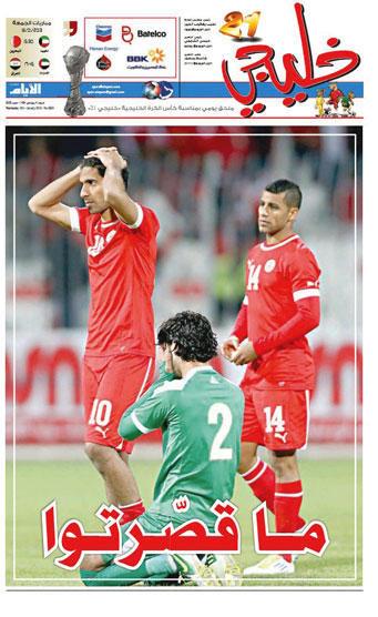 وعنونت صحيفة الايام على صفحتها الاولى لملحقها الرياضي: "ما قصرتوا"، وتابعت في داخل العدد: "ركلات الترجيح لم تبتسم من جديد للبحرين"، و"اسود الرافدين يبددون احلام الاحمر". وعنونت صحيفة اخبار الخليج: "العراق يواجه الامارات في نهائي خليجي 21"، مضيفة: "صاحب الارض يودع الجمهور والارض"، اما صحيفة الوسط فكتبت: "ركلات الحظ تبدد حلم البحرين".وكان منتخب البحرين يبحث عن بلوغ المباراة النهائية، لكي يبقي أمله قائما في احراز اللقب للمرة الاولى في تاريخه، علما أنه لم يذق طعم التتويج الخليحي حتى الآن، إضافة إلى منتخب اليمن.يذكر ان دورات كأس الخليج انطلقت من البحرين عام 1970، وهي تستضيفها للمرة الرابعة.