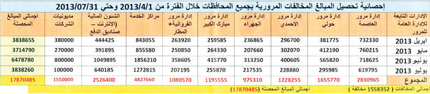 تطبيق القانونوذكر ان «تحصيل هذه المبالغ لم يكن هدفا بقدر تطبيق القانون على الجميع، الذي يجب ان يحترم ويلزم به كل مستخدمي الطريق، حفاظا على سلامتهم وحماية ارواحهم، والذي يعد اهم المحاور التي تعمل على ترسيخها وتأصيلها في نفوس جميع المواطنين والمقيمين على حد سواء».واضاف ان احد المحاور الاساسية لخطة المرور يتعلق بتأهيل رجال المرور قانونيا وتوعويا لكي يكونوا على قدر المسؤولية في تحقيق القانون وتوصيفه وحسن التعامل مع مستخدمي الطريق، حفاظا على هيئة ومكانة رجل الامن وجذب تعاطف وتعاون ومساندة الجميع لهم، ما يسهم في حل الكثير من المشاكل المرورية التي تعتمد بالدرجة الاولى على متانة العلاقة التي يجب ان تحكم رجل المرور بالسائقين والمشاة، من خلال الممارسة الميدانية على الطريق، والتي تعكس مدى تحضر ورقي رجال المرور باعتبارهم عنوان الضبط والنظام والالتزام والحرص على سلامة الجميع كهدف عام. واشار إلى ان المبالغ المحصلة عن المخالفات شملت ادارات مرور العاصمة وحولي والاحمدي والجهراء ومبارك الكبير والفروانية ومرور المطار ومراكز الخدمة وصناديق الدفع عبر الانترنت ومديونيات الشركات، وبلغت حصيلة مرور العاصمة نحو 3 ملايين دينار، بينما بلغت الجهراء مليون دينار.إعادة الانضباطوزاد اللواء العلي ان خطة المرور تعمل على إعادة الانضباط المروري للشارع، وتأهيل رجال واجهزة المرور قانونيا وعمليا وميدانيا، ورفع مستوى ادائهم واسلوب تعاملاتهم، اضافة لتعديل سلوكيات مستخدمي الطريق وتوعيتهم، بالتعاون مع ادارة العلاقات العامة والتوجية المعنوي وادارة الاعلام الامني وبالتنسيق مع كل وزارات وهيئات ومؤسسات الدولة.واردف ان التنسيق مع الوزارات والهيئات جاء لتسريع تنفيذ مشاريع الطرق والجسور والمحاور وتعديل المسارات وتحديد المناطق والاماكن والنقاط الاكثر تسببا في الازدحامات والاختناقات المرورية، وما تشهده الطرق من حوادث ومخالفات، وايجاد الحلول العملية والميدانية من خلال التعامل مع الواقع وطبيعة المشكلة.واشار الى اهمية محور التوعية المرورية الذي تعول عليه كثيرا في ايصال رسالة المرور لكل مستخدمي الطريق من سائقين ومشاة، من خلال الجهد الاعلامي لإدارتي العلاقات العامة والتوجيه المعنوي وادارة الاعلام الامني التي تكثف خططها وبرامجها الاعلامية عبر مختلف وسائل الاعلام من اذاعة وتلفزيون وفضائيات ومطبوعات ارشادية والقاء محاضرات وعقد ندوات وارسال رسائل قصيرة عبر الهواتف النقالة وتبسيط قواعد وآداب المرور، من خلال مواقع التواصل الاجتماعي التي تهدف لنشر الثقافة المرورية التي تستهدف الشباب والاطفال واولياء الامور والطلبة والموظفين والعمال وسائقي الاجرة ووسائل النقل العام وغيرهم من الشرائح، بما يجب عليهم من مسؤوليات والتزامات نحو الحفاظ على سلامتهم وسلامة الآخرين وحق الجميع في طرق اكثر امنا وسلامة.