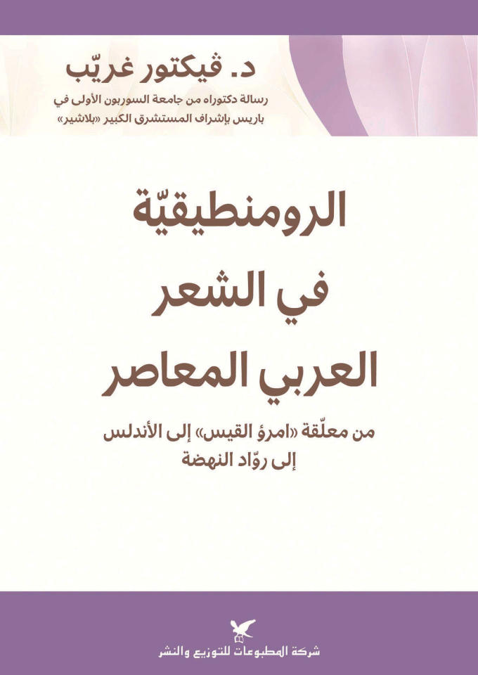 صدر للباحث اللبناني فيكتور غريّب كتابه الجديد «الرومنطيقيّة في الشعر العربي المعاصر - من معلّقة امرؤ القيس إلى الأندلس إلى روّاد النهضة»، عن شركة «المطبوعات للتوزيع والنشر».
