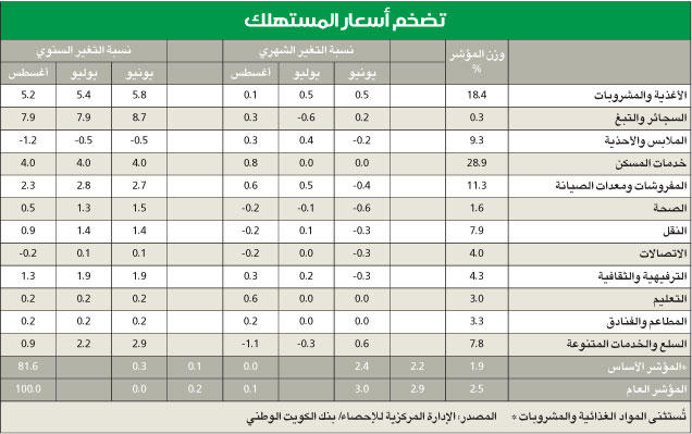 وقد بلغ معدل التضخم في أسعار المواد الغذائية والمشروبات 5.2 في المئة على أساس سنوي في أغسطس، منخفضا من 5.4 في المئة في يوليو، وقد جاء ذلك على نحو مفاجئ بعض الشيء. حيث أن بيانات يوليو المنخفضة قد أشارت إلى أن الزيادة في أسعار المواد الغذائية التي عادة ما ترتبط بشهر رمضان، والتي سجلت انخفاضاً مدة شهرين هذا العام، من الممكن أن تظهر في بيانات أغسطس. وبينما سجلت شريحة المواد الغذائية ارتفاعاً بواقع 0.5 في المئة على أساس شهري في كلا الشهرين، فقد كانت الارتفاعات أقل بما هي عادة في هذا الموسم. ويظل التضخم في أسعار المواد الغذائية مصدراً متزايداً للضغوط التضخمية بشكل عام، حيث بلغ أكثر من 5 في المئة. ومن غير المحتمل أن يتسارع التضخم في أسعار المواد الغذائية نتيجة تراجع الأسعار العالمية للمواد الغذائية خلال العام الماضي، الأمر الذي قد يؤدي الى تراجع الأسعار المحلية للمواد الغذائية. ومن المحتمل أن يصل التضخم في أسعار المواد الغذائية إلى أقل من 4 في المئة لاحقاً خلال هذا العام. وقد تسببت المكونات الأخرى في انخفاض التضخم العام في أغسطس كشريحة المفروشات والصيانة المنزلية وشريحة السلع والخدمات الأخرى وشريحة الملابس والأحذية. وقد هبطت الشريحة الأخيرة لتصل الى 1.2 في المئة خلال العام الماضي بعد أن كانت تبلغ 5.0 في المئة سنوياً، وذلك بعد أن شهدت عقدا من الارتفاعات الكبيرة. وبالمجمل، فقد ساهم هبوط التضخم في تلك مكونات الثلاثة في خفض التضخم العام بواقع 1 في المئة خلال العام الماضي. أما التضخم في المكونات الأخرى، فقد ظل كما هو دون تغيير منذ شهر يوليو من دون أن يترك تأثيرا كبيرا على المؤشر العام. حيث انخفض معدل التضخم الأساس (الذي يستثني أسعار المواد الغذائية) ليصل الى 1.9 في المئة على أساس سنوي من 2.2 في المئة في يوليو، ليتراجع بواقع 0.9 في المئة نقطة عن مستواه للعام الماضي. ويعزى انخفاض معدل التضخم الأساس على الأرجح إلى اعتدال النشاط الاقتصادي ومحدودية الضغوط التضخمية الناجمة عن أسعار الواردات وقوة الدينار الكويتي الموزون تجارياً.ولولا شريحة الإسكان، لكان الهبوط في معدل التضخم الأساس أكثر حدة. فقد ارتفع معدل التضخم في أسعار الإيجار الى 4.0 في المئة خلال العام الماضي من 1.7 في المئة سنوياً. وباستثناء المواد الغذائية والإسكان، فقد انخفض التضخم في المكونات الأخرى ليصل الى 0.7 في المئة سنوياً في أغسطس من 3.4 في المئة سنوياً في العام الماضي.وبالنتيجة، فقد انخفض معدل التضخم خلال شهر أغسطس. لكن معدل التضخم الأساس قد يرتفع قليلا خلال الأشهر المقبلة مدعوما بعوامل المقارنة وتحسن النشاط الاقتصادي. ولكننا لا نزال نتوقع أن يأتي معدل التضخم هذا العام معتدلاً عند 2.5 في المئة.