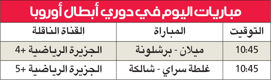ويدخل برشلونة اللقاء، وهو في ذروة مستواه بدليل تحليقه في صدارة الدوري المحلي بفارق شاسع عن اتلتيكو مدربد اقرب مطارديه، كما انه مرشح لبلوغ المباراة النهائية من مسابقة كأس إسبانيا بعد ان انتزع التعادل من غريمه التقليدي ريال مدريد في عقر دار الأخير 1-1 على ملعب سانتياغو برنابيو.ويحلم برشلونة بإحراز الثلاثية كما فعل قبل موسمين الذي كان الافضل في تاريخه، بعد ان فاز بستة القاب هي بالاضافة الى اللقب الأوروبي واللقبين المحلين، كأس السوبر الأوروبية وكأس السوبر المحلية وبطولة العالم للأندية.ولا حدود لطموحات برشلونة، خصوصا في ظل التألق غير الاعتيادي لنجمه ليونيل ميسي. فقد سجل ميسي 56 هدفا في دوري ابطال اوروبا، وهو يسير بخطى ثابتة نحو تخطي الرقم القياسي المسجل باسم الإسباني راؤول (71 هدفا). أما في الدوري الإسباني، فقد سمحت ثنائية ميسي في مرمى غرناطة (2-1) بتحقيقه رقما خارقا من الأهداف بلغ 37 هدفا في 24 مباراة، كما رفع رصيده الاجمالي من الاهداف خلال مسيرته الى 301 هدف.ميلان يستعيد عافيتهأما ميلان فبدأ ينهض بعد بداية متعثرة في مطلع الموسم الحالي، فحقق عودة استعراضية من خلال احتلاله احد المراكز الثلاثة الاولى في الدوري الإيطالي بفريق متجدد جله من العناصر الشابة، وهو يعتمد بشكل كبير على الثنائي المتكامل في خط الهجوم المؤلف من ماريو بالوتيلي (4 اهداف في 3 مباريات) وستيفان الشعراوي. لكن بالوتيلي لن يتمكن من المشاركة بعد ان دافع عن الوان مانشستر سيتي في دور المجموعات.شالكه في ضيافة غلطة سراي وعلى ملعب علي سامي ين سبور كومبليكسي في اسطنبول، يستضيف غلطة سراي الطموح شالكه المتذبذب المستوى محليا. ويعول الفريق التركي على ثلاثي خط الهجوم الرهيب في صفوفه، والمؤلف من الهولندي ويسلي سنايدر والعاجي ديدييه دروغبا، والهداف المحلي بوراك يلماظ صاحب ستة اهداف في ست مباريات في المسابقة القارية حتى الآن.وكان غلطة سراي استهل مشواره الأوروبي بشكل سيئ للغاية بخسارتيه مباراتيه الأوليين، لكن رجال المدرب فاتح تيريم نجحوا في تحقيق ثلاثة انتصارات متتالية لينتزعوا المركز الثاني في المجموعة الثامنة وراء مانشستر يونايتد.ومن اجل تعزيز حظوظه في بلوغ مراحل متقدمة قام النادي بإتمام صفقتين رائعين مع سنايدر ودروغبا خلال فترة الانتقالات الشتوية، وقال رئيسه اونال ايسال: "لا بد ان تؤدي هذه الاستثمارات الى نتائج ايجابية على ارض الملعب".وأضاف أن "العائدات من المشاركة في دوري ابطال اوروبا يمكنها ان تسد النفقات التي قمنا بها من اجل التعاقد مع هذين النجمين".ويعتبر شالكه احد اربعة فرق لم تهزم في النسخة الحالية من دوري الابطال، كما انه لم يخسر سوى مرة واحدة في تسع مباريات خاضها خارج ملعبه، وقد نجح في تحقيق الفوز على ارسنال على ملعب الاخير في لندن في دور المجموعات. لكن اداء شالكه تراجع كثيرا في الآونة الأخيرة وتراجع من المركز الثالث الى التاسع في الدوري المحلي.هونتيلار يعود إلى صفوف شالكهويعود الى صفوف شالكه هدافه الهولندي كلاس يان هونتيلار بعد اصابة في عينه ابعدته حوالي اسبوعين عن الملاعب.وتخلى الفريق الألماني عن لاعب وسطه لويس هولتبي في فترة الانتقالات الشتوية لمصلحة توتنهام، في حين تعاقد مع لاعب الوسط البرازيلي ميشال باستوس من ليون الفرنسي.وللمفارقة فإن خمسة لاعبين من غلطة سراي ولدوا في المانيا ابرزهم لاعب الوسط حميد التينتوب الذي لعب لشالكه بالذات من 2003 الى 2007.وستكون المباراة نارية بالنسبة لمدرب شالكه الجديد ينس كيلر الذي حل بدلا من يوب ستيفنس في ديسمبر، خصوصا ان الأجواء في مدرجات ملعب علي سامي دائما ما تكون حامية جدا.