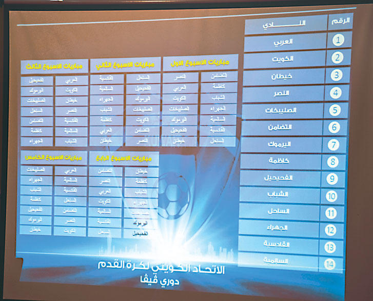 ويلتقي في الأسبوع الأول لـ"الدمج" كاظمة مع العربي في أقوى مواجهات الأسبوع الأول، والتضامن مع النصر، والشباب مع الكويت، والجهراء مع الصليبيخات، والسالمية مع اليرموك، والقادسية مع الفحيحيل، والساحل مع خيطان، علما أن القرعة التي أجريت خاصة ببطولتي الدمج والعام معاً، مع اختلاف طفيف في مواعيد البطولتين.الفهد: تحقيق مبدأتكافؤ الفرصوأكد رئيس مجلس إدارة الاتحاد الشيخ طلال الفهد أن دوري الدمج، الذي يختتم منافساته 26 ابريل، ويقام من دورين، سيقام يومي الجمعة والسبت من كل أسبوع، في حين يقام الدوري العام الجمعة، أما منافسات كأس سمو ولي العهد وكأس سمو الأمير فتقام يوم الثلاثاء من كل أسبوع.وأضاف الفهد، خلال المؤتمر الصحافي الذي عقده على هامش القرعة، أن القسم الأول من دوري فيفا سينتهي 21 ديسمبر، وتقرر إيقاف البطولة بعد هذا التاريخ مباشرة، حيث يستعد المنتخب الرديف لخوض منافسات البطولة الخليجية التي تستضيفها عمان في مطلع العام المقبل، وسينطلق الدور الثاني 24 يناير، وقد يتم تأجيله حتى 5 فبراير في حال تأهل منتخب الشباب لنهائي كأس آسيا.وتابع: "تم الحرص على إقامة عدد متساو من المباريات بين الأندية التي ستشارك خارجيا مع الأندية التي تكتفي بالمشاركات الداخلية، تحقيقاً لمبدأ تكافؤ الفرص بين الجميع".وأِشار إلى أنه تقرر إقامة بطولة كأس الاتحاد التنشيطية من 16 فبراير حتى 20 أبريل، وسيتم تقسيم الأندية إلى مجموعتين، حيث يأتي بطل الدوري على رأس مجموعة، وبطل كأس سمو الأمير على رأس المجموعة الأخرى، ويصعد الأول والثاني من كل مجموعة إلى الدور نصف النهائي، وتلعب الفرق المتأهلة بطريقة "المقص".وشدد على أن هناك عدة لجان ستعتمد خلال الفترة المقبلة الملاعب التي ستقام عليها البطولات، مبينا أن هناك عدة معايير تم وضعها يتعين على الأندية تلبيتها حتى تستضيف البطولات على ملاعبها، لافتا إلى أنه سيتم التغاضي عن بعض المعايير في الموسم المقبل فقط، مطالبا الأندية بمخاطبة الهيئة العامة للشباب والرياضة لتلافي أي مشكلات تواجهها الملاعب.اجتماع تنسيقيعقد الشيخ طلال الفهد اجتماعا استمر نحو 50 دقيقة مع ممثلي الأندية، قبل انطلاق مراسم القرعة، لشرح آلية القرعة والنظام الجديد لكأس سمو ولي العهد، وشهد الاجتماع أبرز مقترحات الأندية على اللائحة التي أصدرتها لجنة المسابقات بالاتحاد مؤخرا، ومن ثم وافق مسؤولو الاتحاد على اعتماد بعض هذه التعديلات. الفهد: «الهيئة» بصدد صرف الدعم الحكومي للاتحادأكد الشيخ طلال الفهد أن الهيئة العامة للشباب والرياضة بصدد صرف دفعات من الدعم الحكومي الخاص بالاتحاد، وهذه الدفعات خاصة بالمعسكرات والمشاركات الخارجية.وأضاف الفهد، في تصريح على هامش المؤتمر الصحافي لمراسم القرعة، أن الدفعة الأولى سيتسلمها الاتحاد خلال الأيام القليلة المقبلة، ما يعني انتفاء أسباب تعليق النشاط الكروي على المستويين الخارجي والداخلي، والذي كان مزمعا تفعيله 15 الجاري وفقاً لقرار الجمعية العمومية المنعقدة 24 من الشهر نفسه. يذكر أن الاتحاد هدد بتعليق النشاط الكروي في حال عدم حصوله على الدعم الحكومي، حيث وجه مسؤولوه الدعوة إلى أعضاء الجمعية العمومية لعقد اجتماع غير عادي لمناقشة قرار التعليق، وتم بالفعل اتخاذ قرار في هذا الصدد، لكن تم تأجيله إلى 15 الجاري كمهلة أخيرة للحكومة، ومن ثم تفعيله في حال عدم وصول الدعم الحكومي.نظام جديد لبطولتي كأس الأمير وولي العهدتقام بطولتا كأس سمو الأمير وكأس سمو ولي العهد بنظام جديد مختلف تماما عن الأنظمة التي كانت متبعة سابقا، سواء بنظام خروج المغلوب أو المجموعات، حيث تقرر أن تقام كل منهما من ست مراحل، وتم تصنيف الأندية وفقا للمراكز التي حصلت عليها في الموسم الماضي.وتستهل المرحلة الأولى من منافسات بطولة كأس سمو ولي العهد في 3 سبتمبر المقبل، ويلتقي خلالها اصحاب المراكز الأربعة الأخيرة في بطولة دوري الدرجة الأولى، وتقام هذه المرحلة من مباراة واحدة على ملاعب الأندية صاحبة ال
