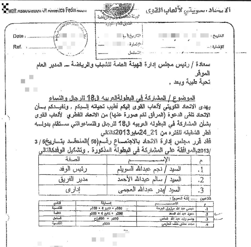 في إطار مسلسل اتحاد ألعاب القوى الفوضوي صعق المسؤولون في الهيئة العامة للشباب والرياضة من ورود كتابين من الاتحاد يحملان نفس المضمون للمشاركة في البطولة العربية يختلف فيهما أسماء الوفد الإداري فقط.